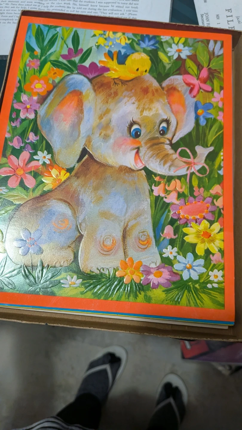 Giving away vintage greeting cards. It features colorful illustrations of animals and flowers. The cards are in good condition for their age and has a heartwarming message inside.