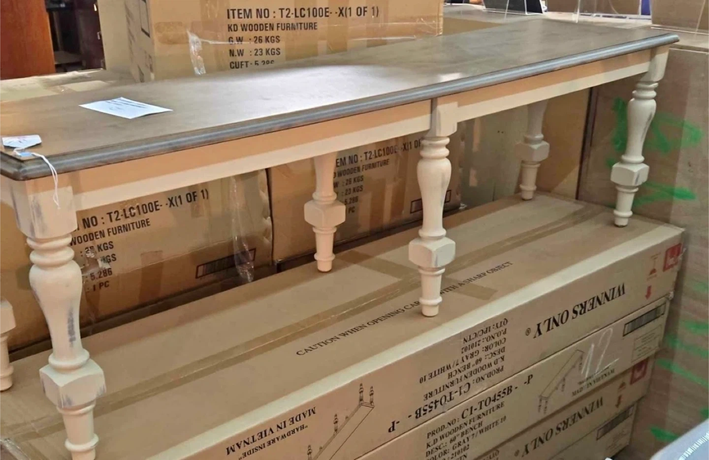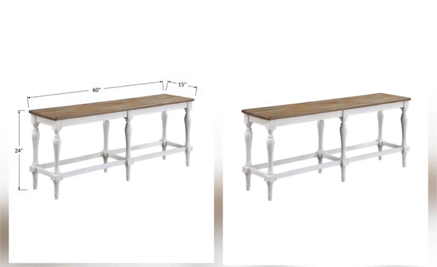 This KD Wooden Furniture bench is in great condition! It features a gray top with white legs. Dimensions are 60" x 15" x 24".