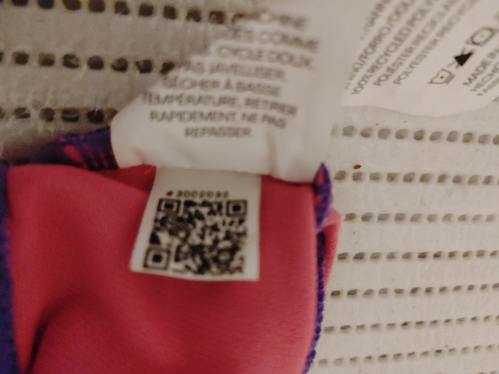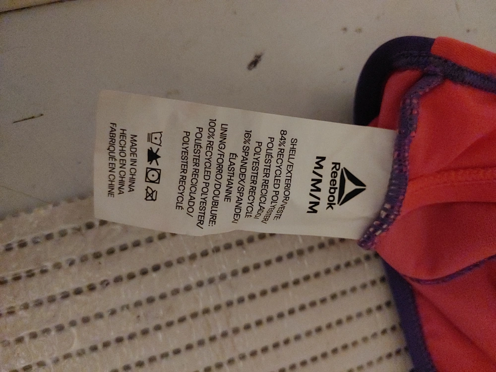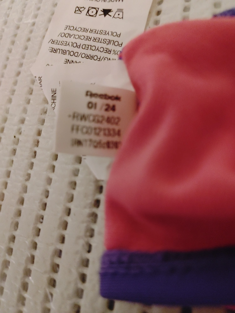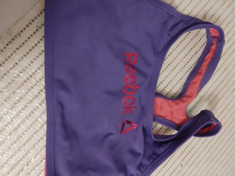 Selling a Reebok sports bra in size M. It's a mix of purple and pink.