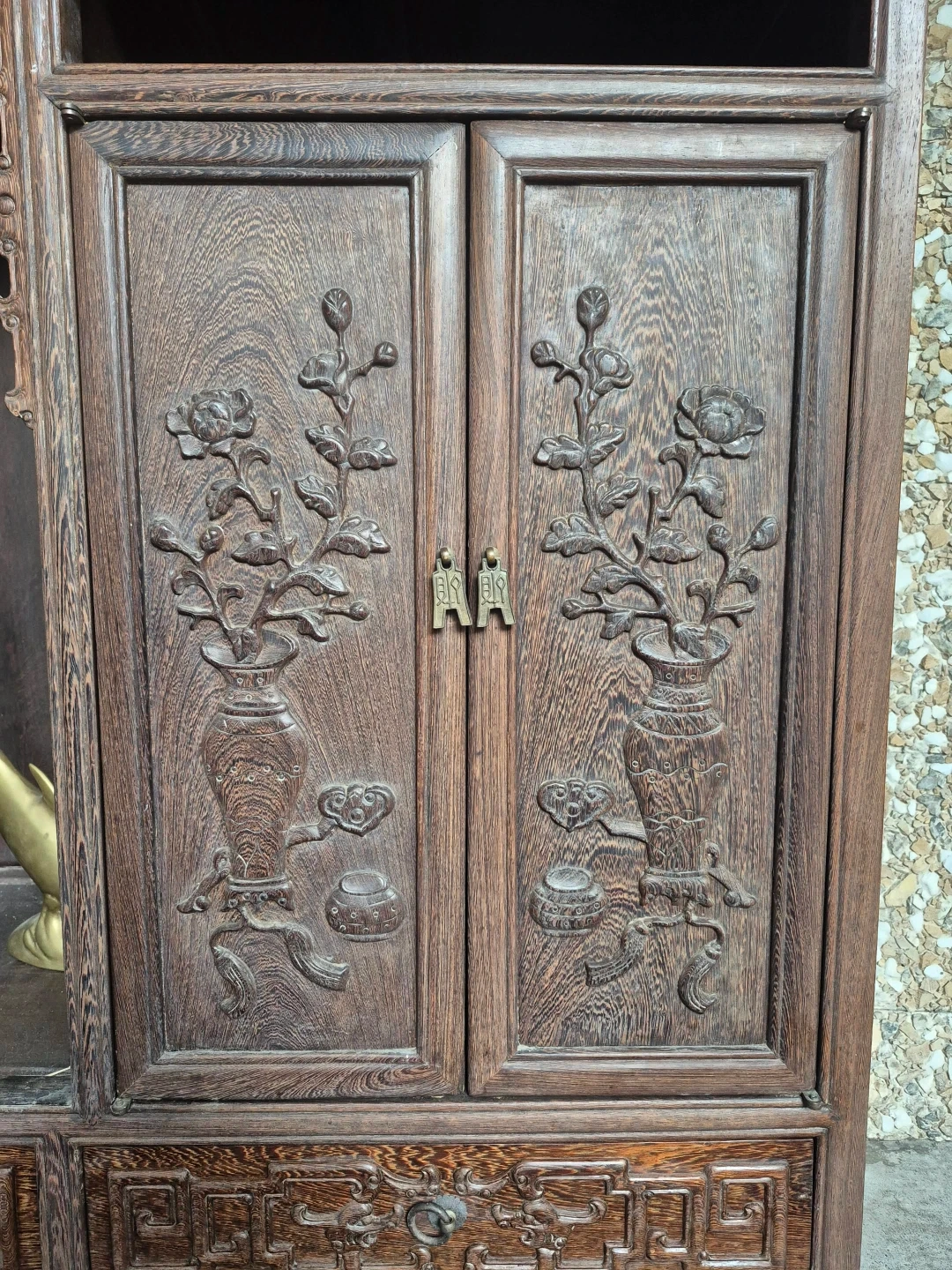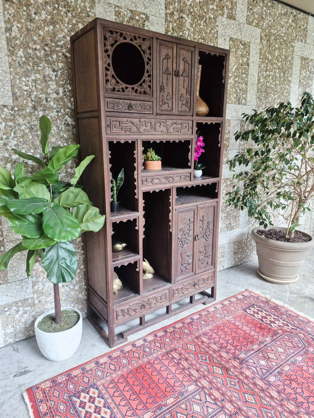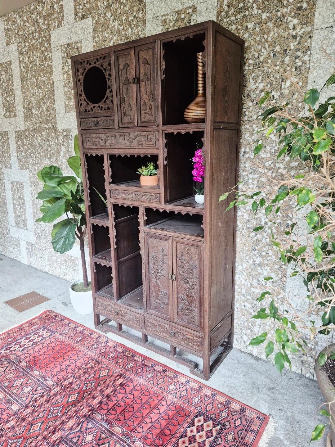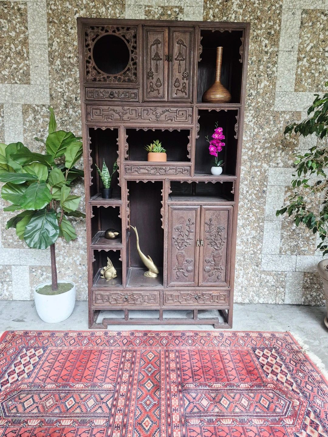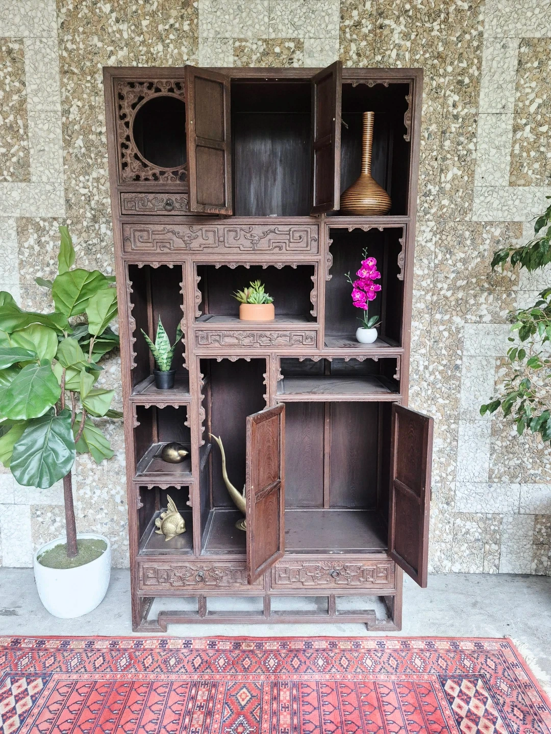Features multiple staggered shelves and decorative carved details, perfect for showcasing plants, art, books, or collectibles.