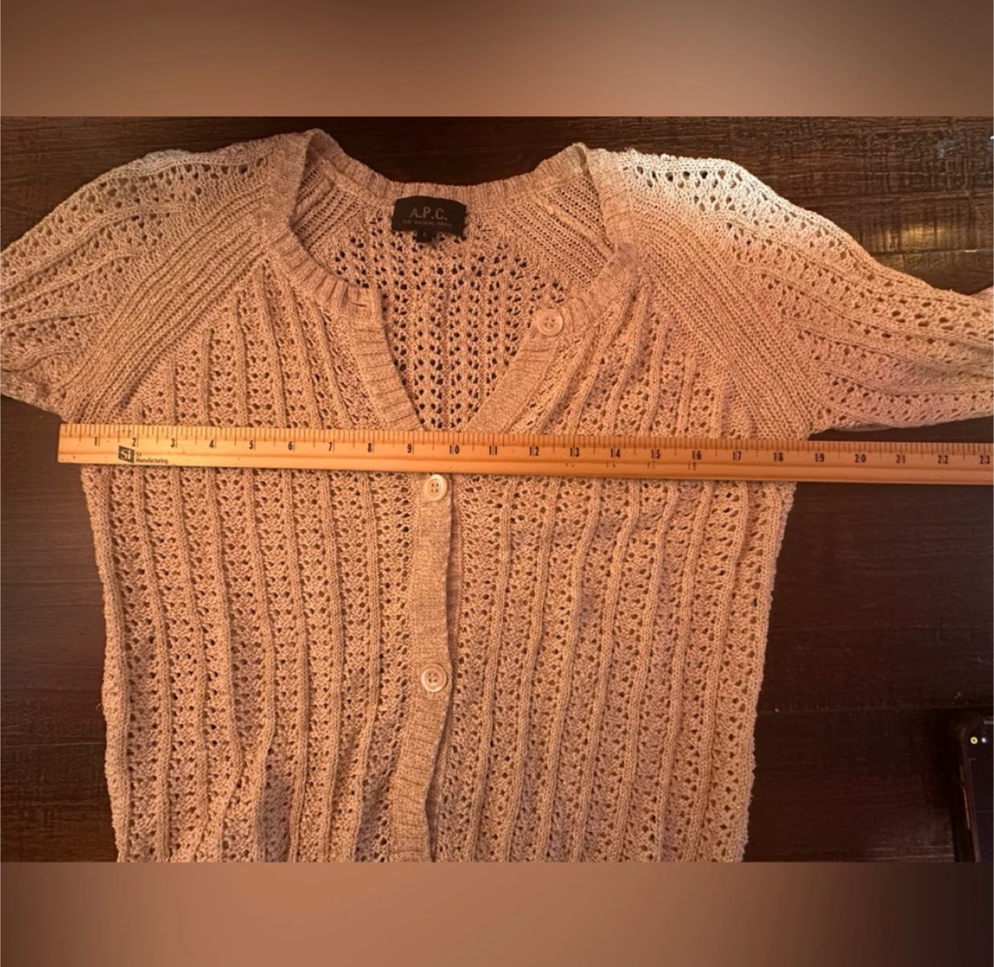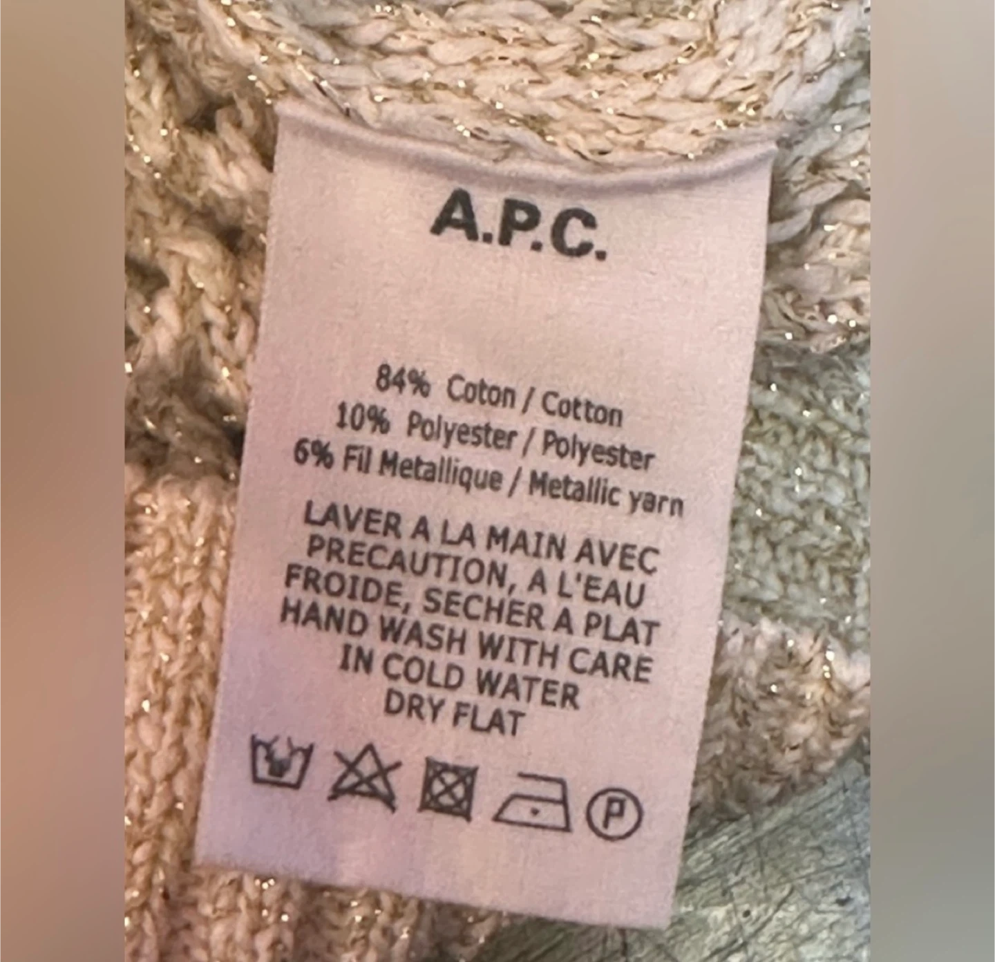 Beautiful A.P.C. Rue Madame Paris knit cardigan in a soft cream tone with subtle metallic thread woven throughout for a gentle shimmer.