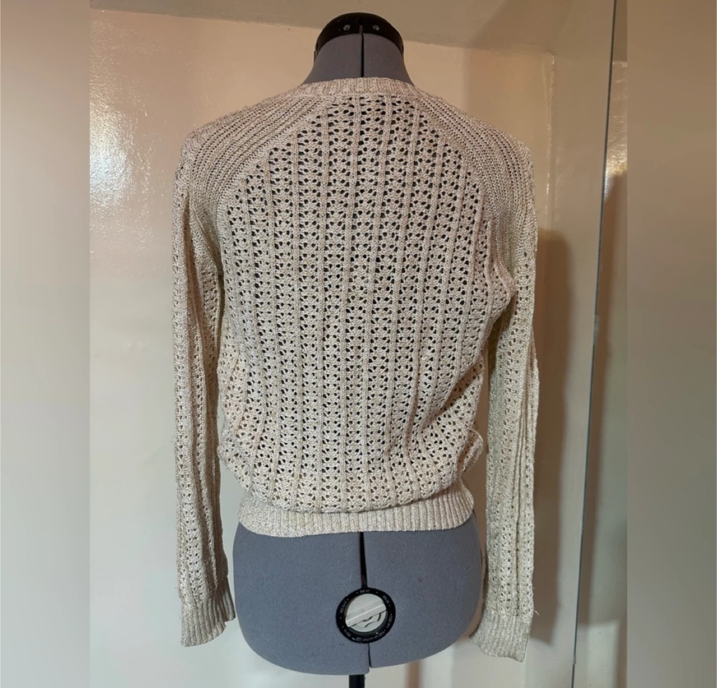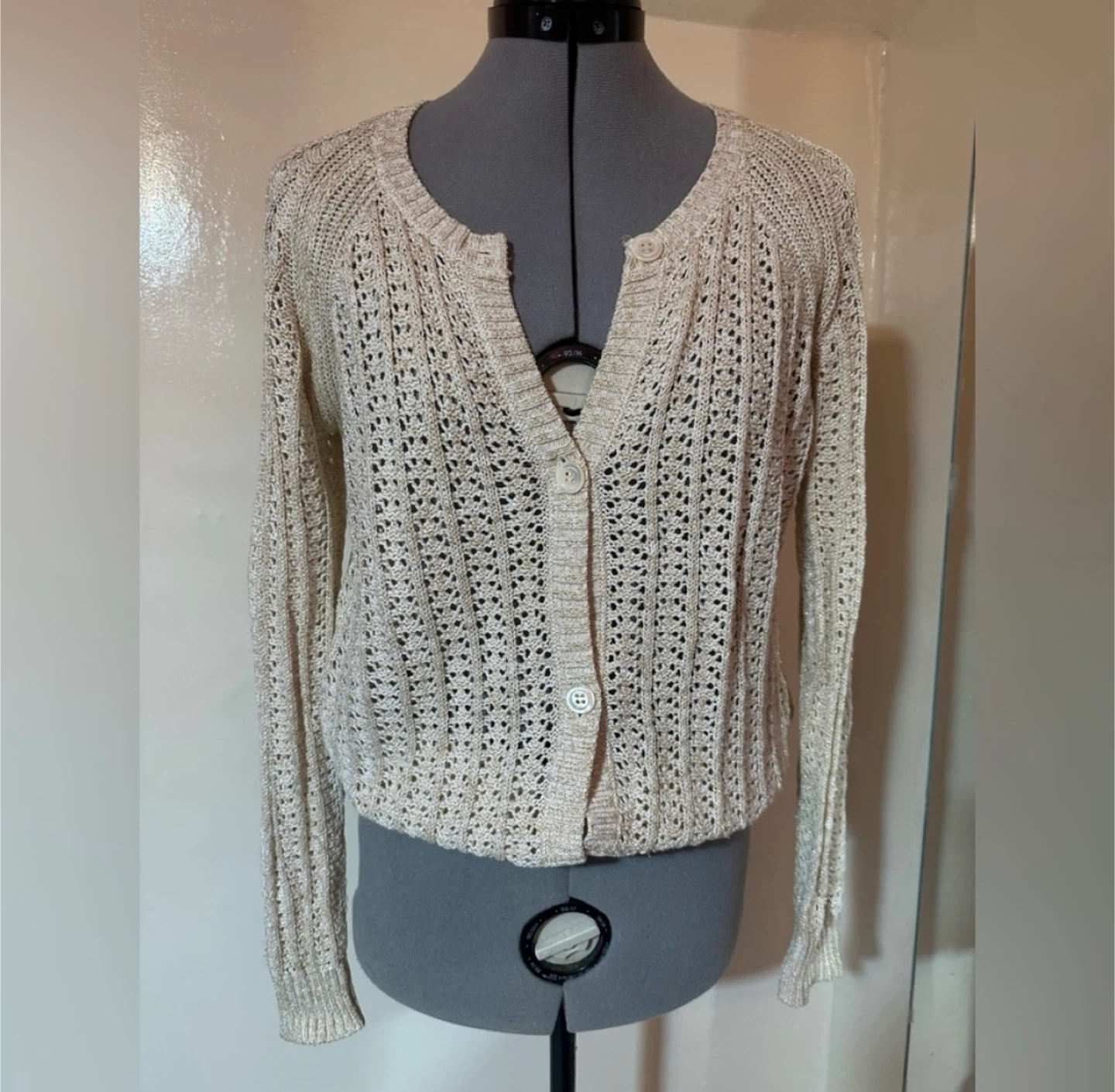 This piece features an openwork / eyelet knit pattern, classic button-front closure, and a slightly cropped, fitted silhouette that works beautifully layered over dresses or paired with high-waisted denim.