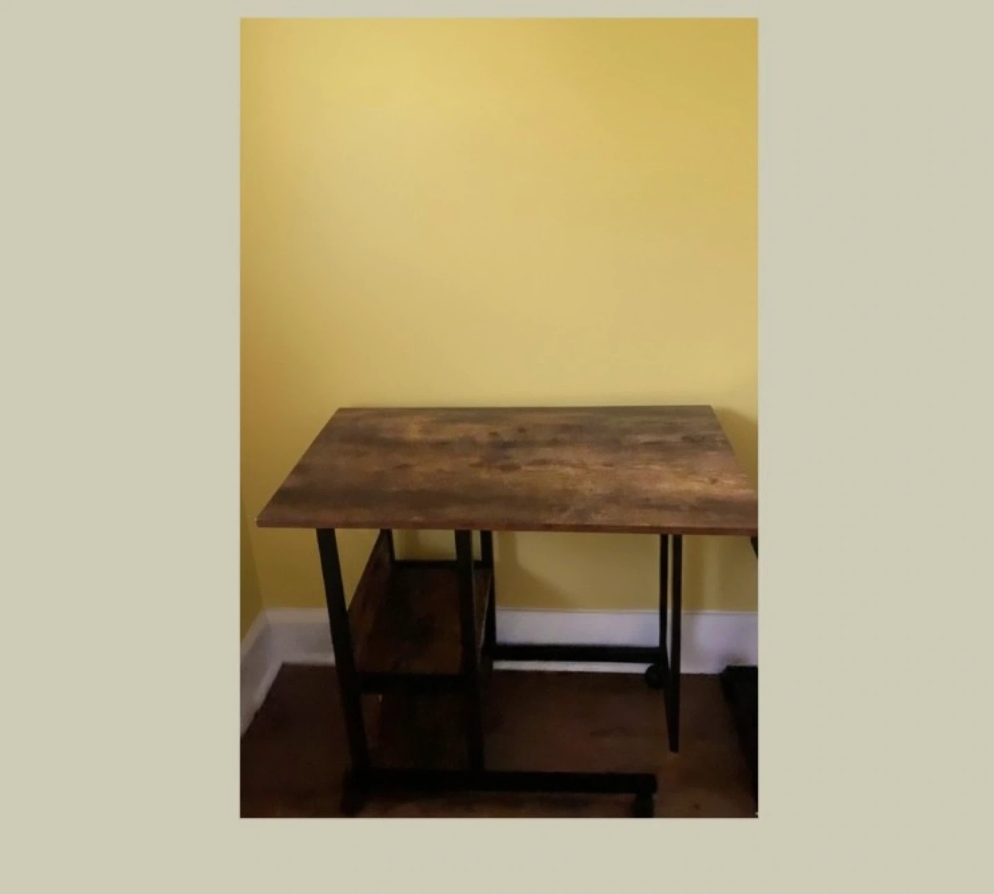Selling a rolling overbed table desk! It features a rustic brown tabletop with a black metal frame and has wheels for easy movement. Perfect for using as a bedside table or as a portable workstation