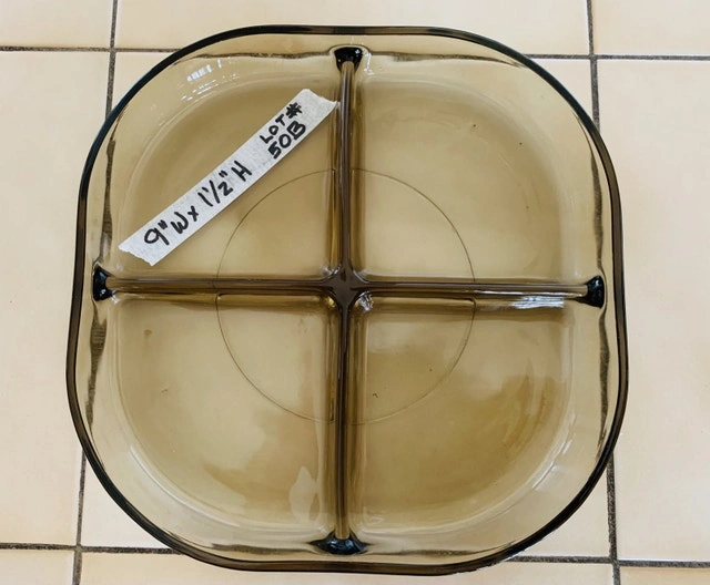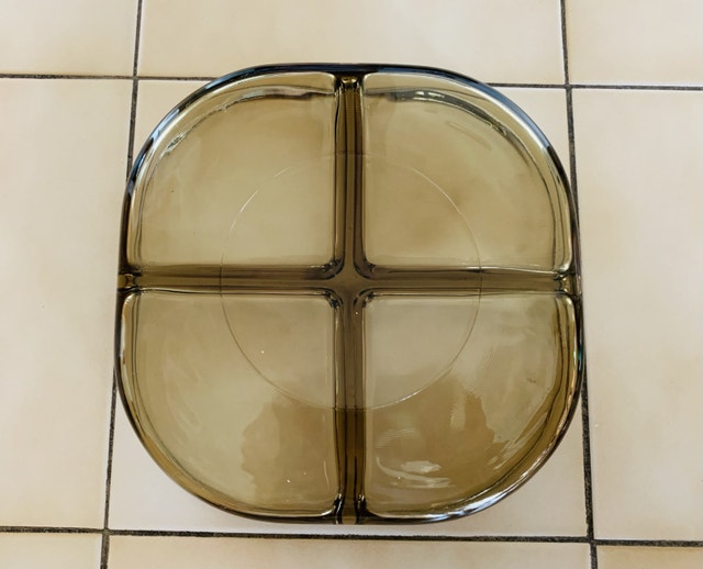 Glass serving dish, perfect for entertaining or adding a retro touch to your kitchen. This used, four-sectioned dish is in good condition. Dimensions: 9" x 9". This versatile dish is great for serving snacks, appetizers, or condiments. Pickup : Scarborough, Finch, and Kennedy