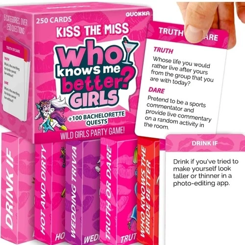 Elevate your bachelorette party with the QUOKKA Bachelorette Party Games Kiss The Miss. This engaging card game is designed to entertain guests of 21 years and older, ensuring a memorable night for the bride-to-be and her friends. With 250 high-quality cards, players can indulge in a game that combines excitement and silliness, perfect for breaking the ice and sparking conversation.