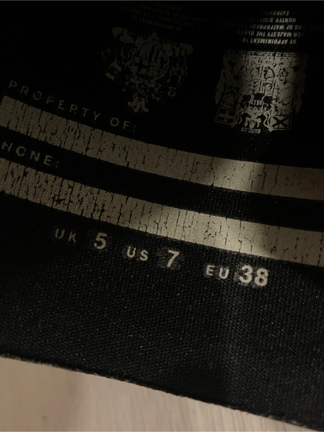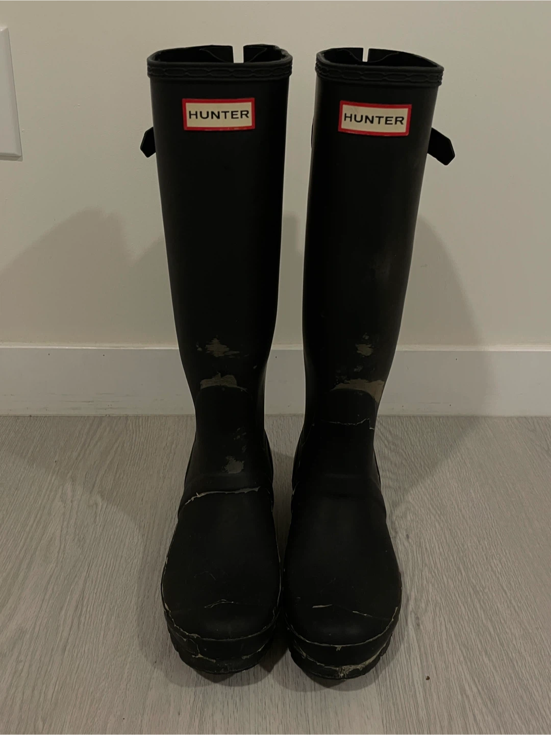 Selling a pair of Hunter rain boots in used condition. They are a size US 7 and have some visible wear and tear, as shown in the pictures. Still lots of life left in them for rainy days!