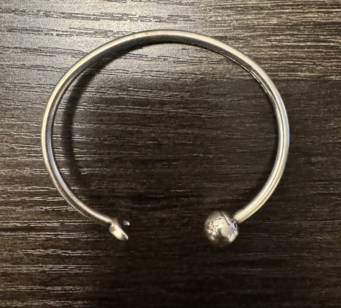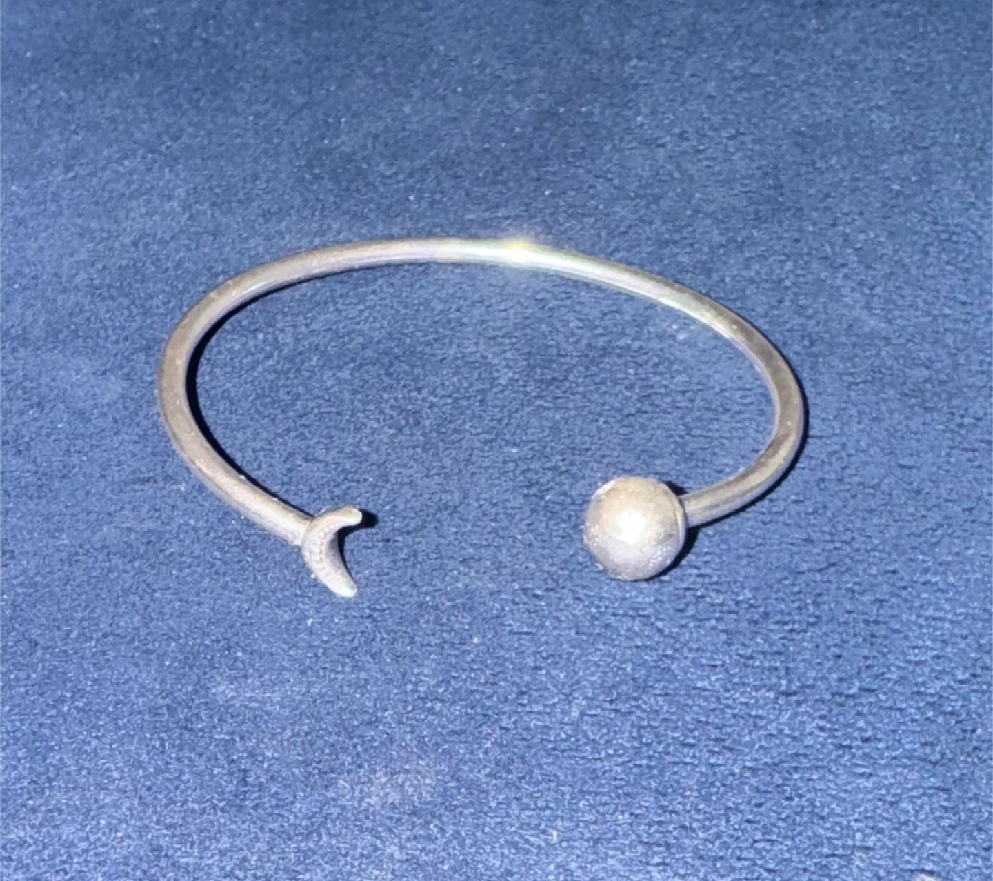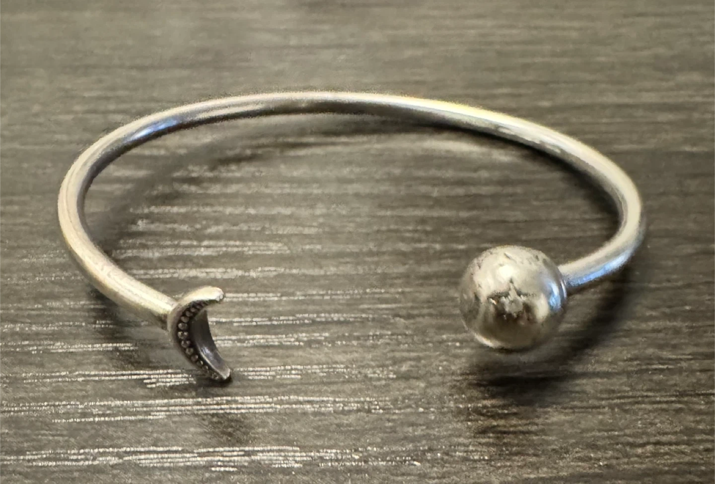 Selling a Pandora silver bangle bracelet. It has a moon on one end and a ball on the other. It's in good condition!