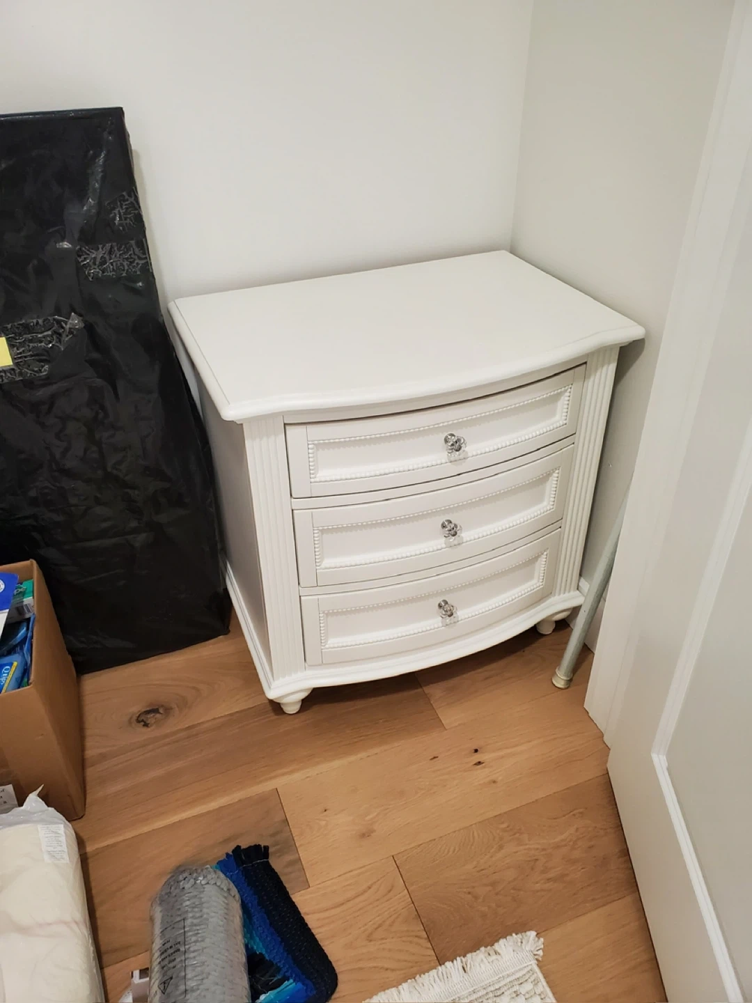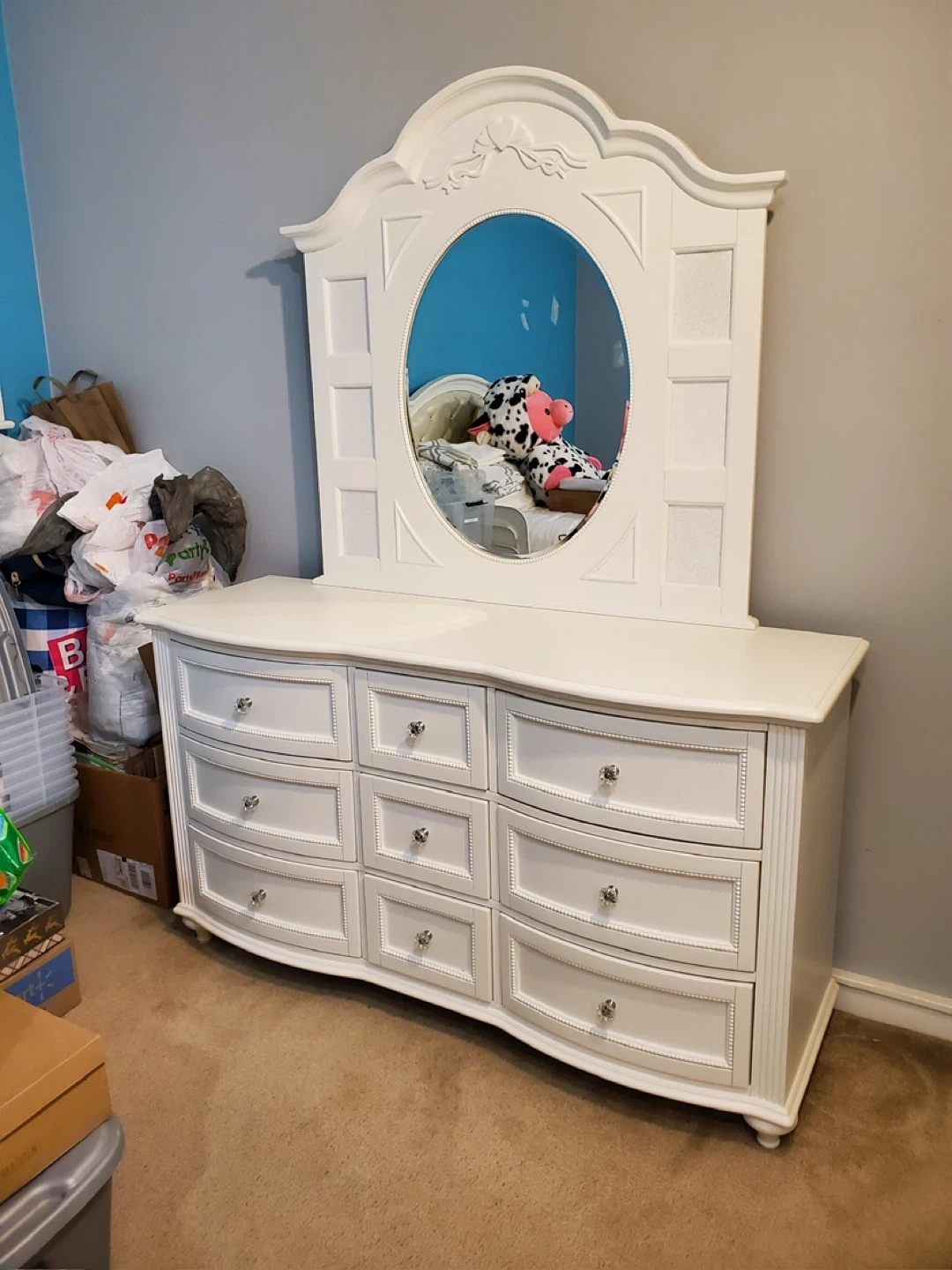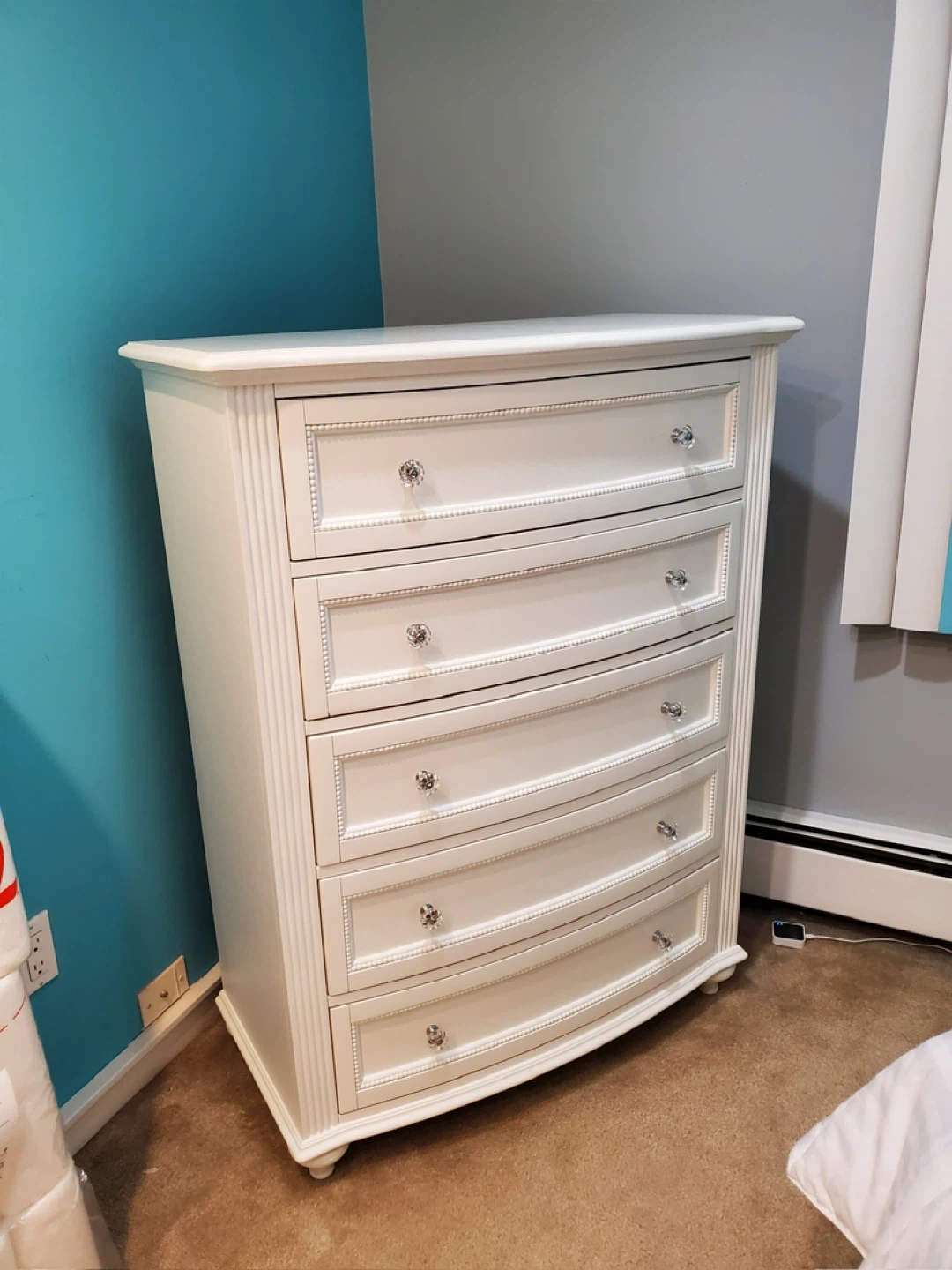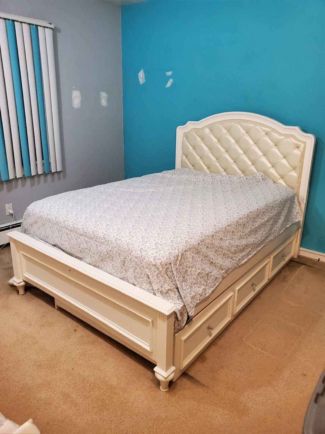 Selling a complete white bedroom set with full sized mattress. It includes a bed with a tufted headboard and either twin mattress for 2nd sleeper or storage drawer underneath, a dresser with a mirror, a tall dresser, and a nightstand. All pieces have a matching design with crystal-like knobs. Great condition, like new and ready for a new home!