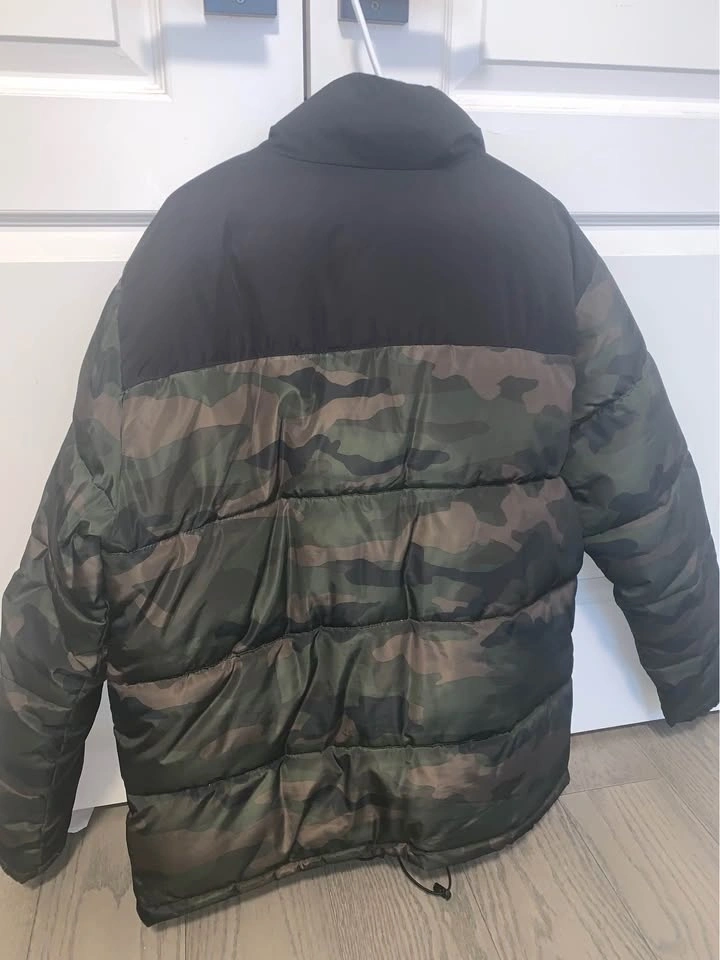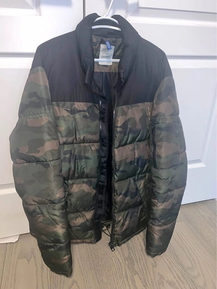 Selling a men’s H&M green camouflage puffer jacket in size Medium. Worn no more than 3 times, in excellent, like-new condition. This jacket doesn’t fit me anymore, so I’m letting it go. H&M quality is solid and durable, making this a great everyday or winter layering piece.