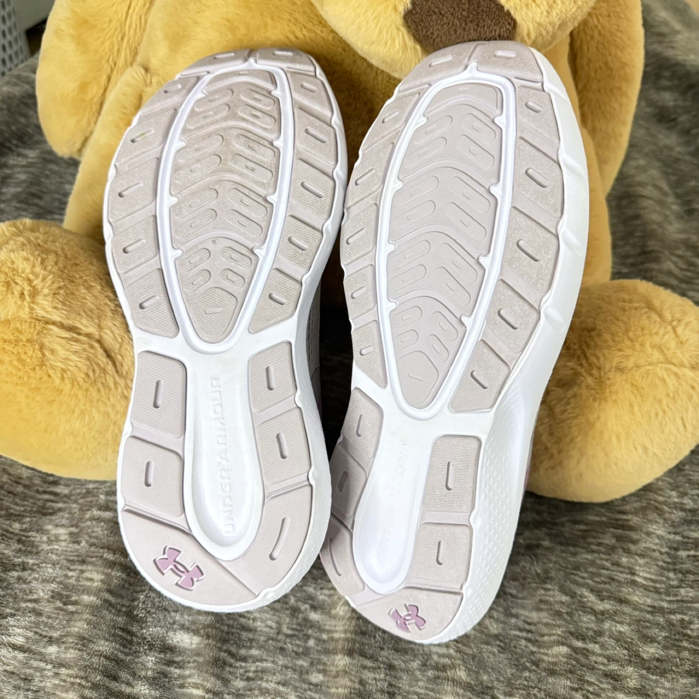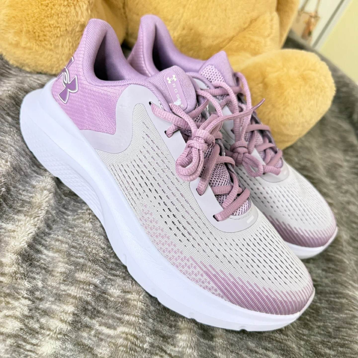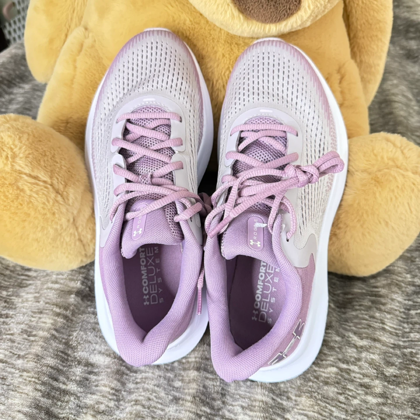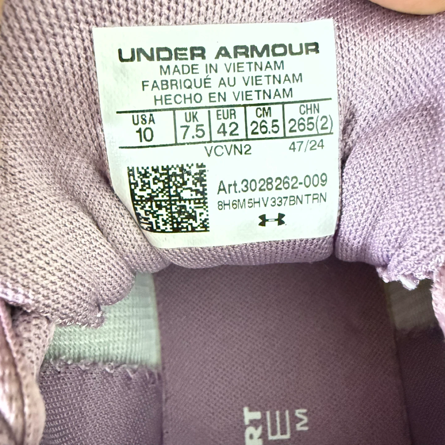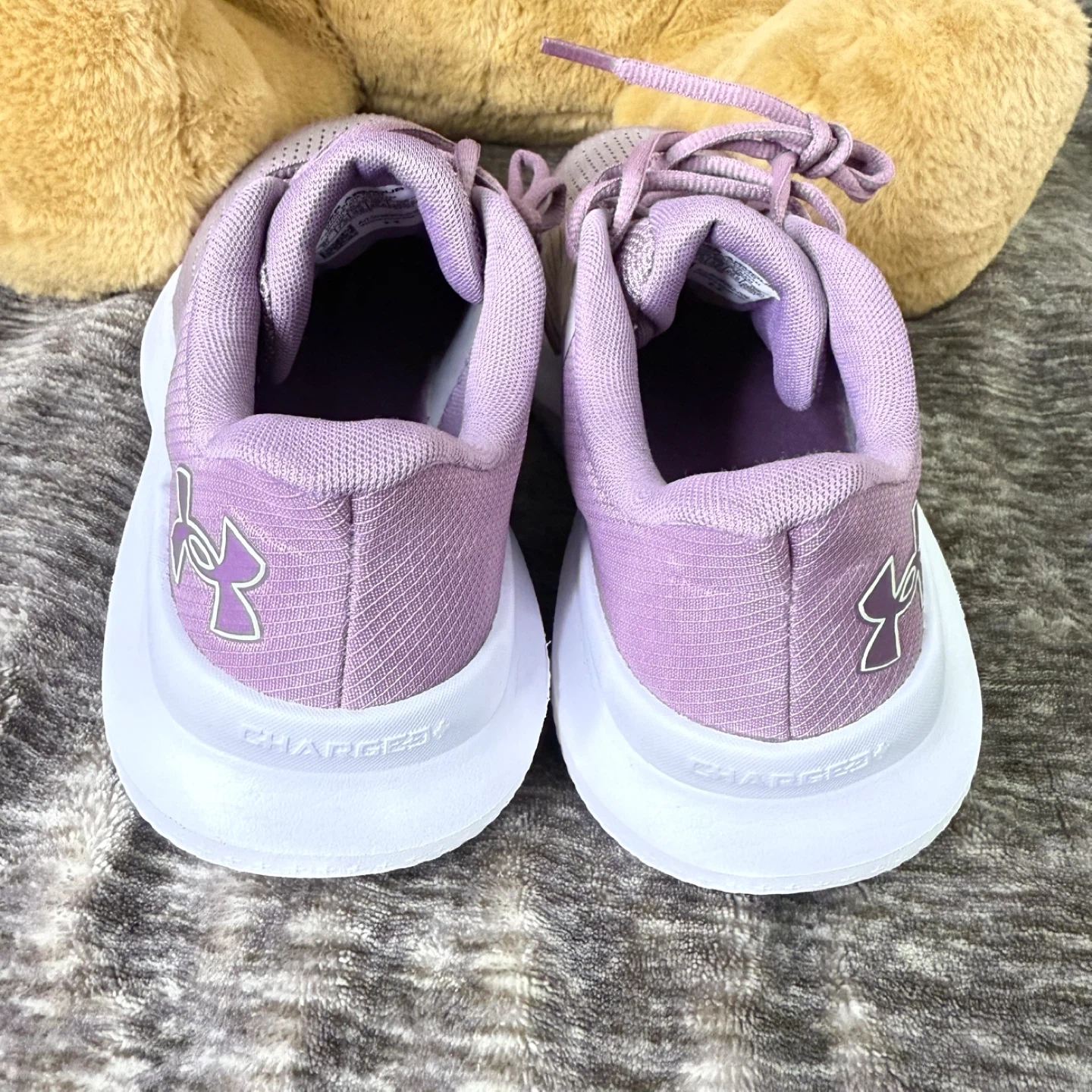These are Under Armour Charged running shoes in a pretty lavender color. They're in great condition and ready for your next run or workout! The Charged cushioning provides great impact absorption and a responsive feel.
