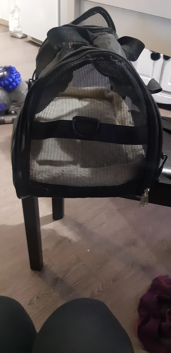 Selling a black pet carrier. It looks to be in good condition and has mesh sides for ventilation. It also has a soft, plush interior for your furry friend's comfort