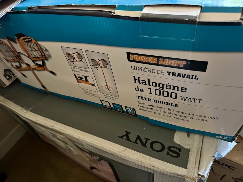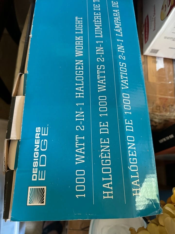 Designers Edge 1000 Watt Portable Flood Light with box. Please ask in case of any questions. I have 2 of them, if you need a 2nd one.