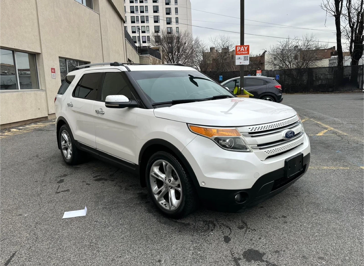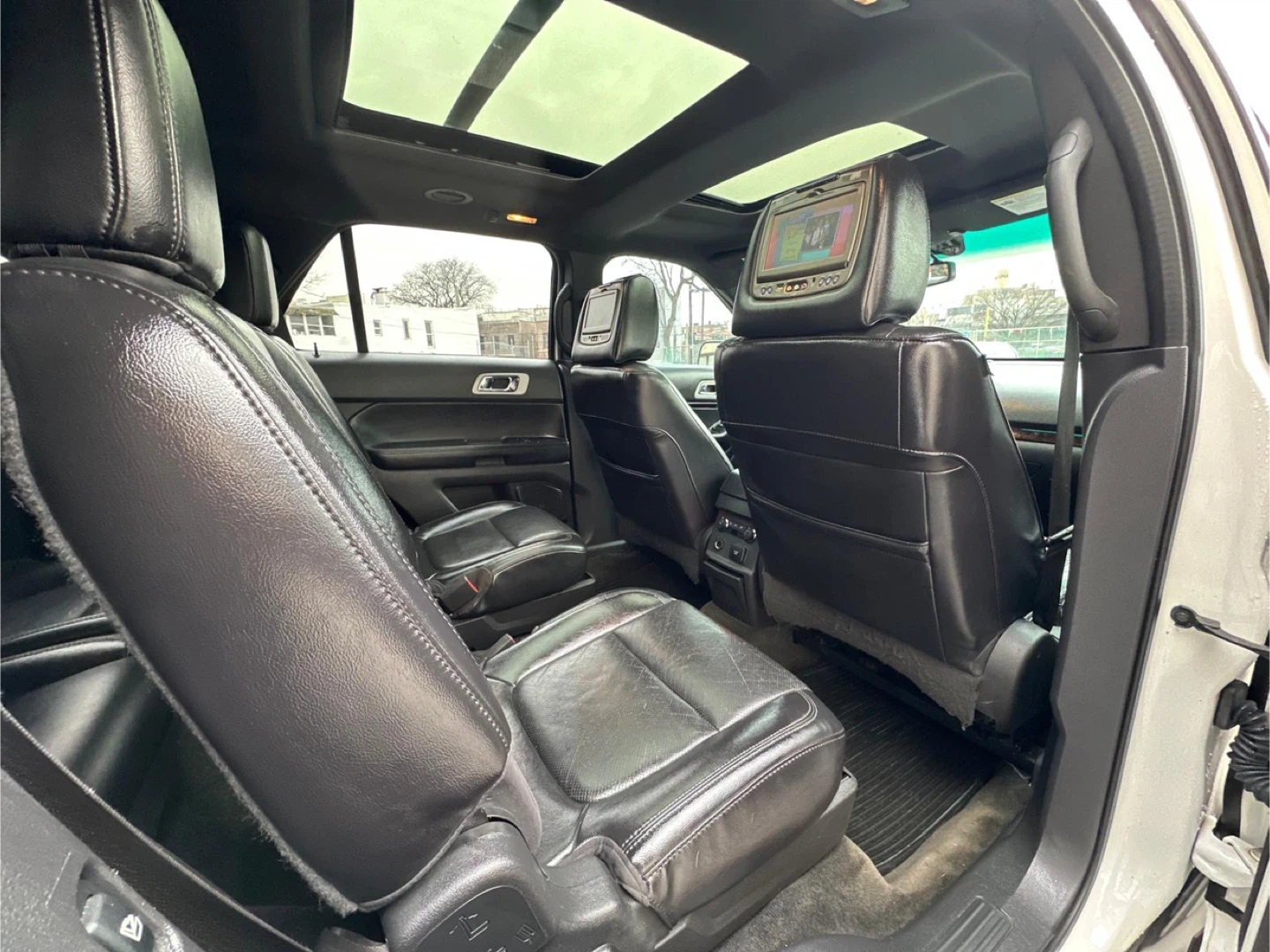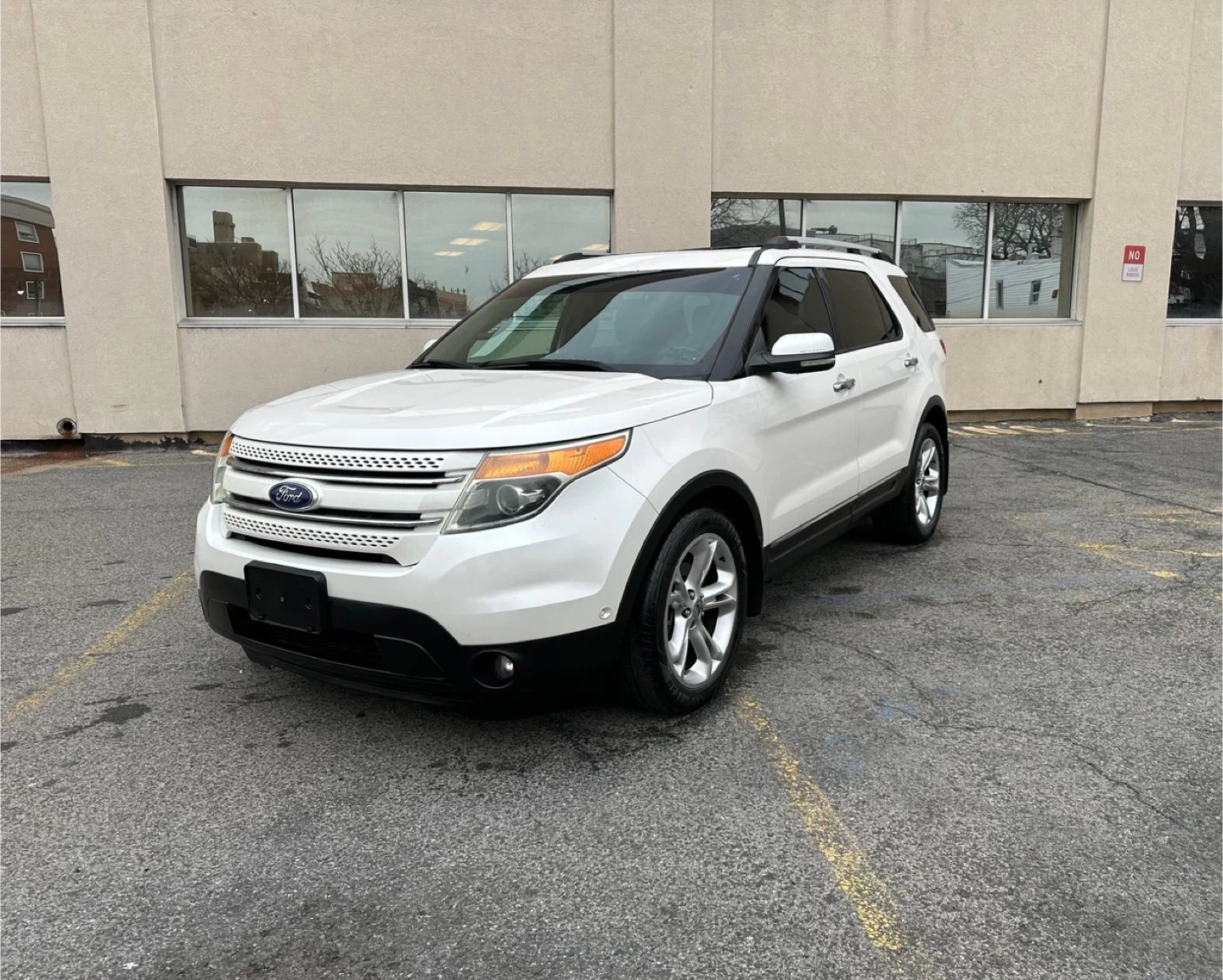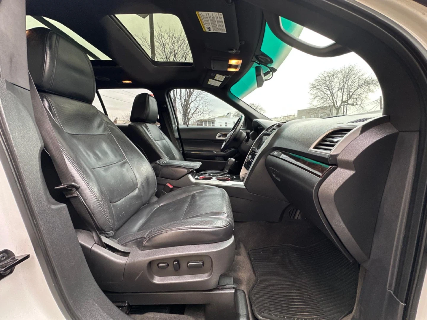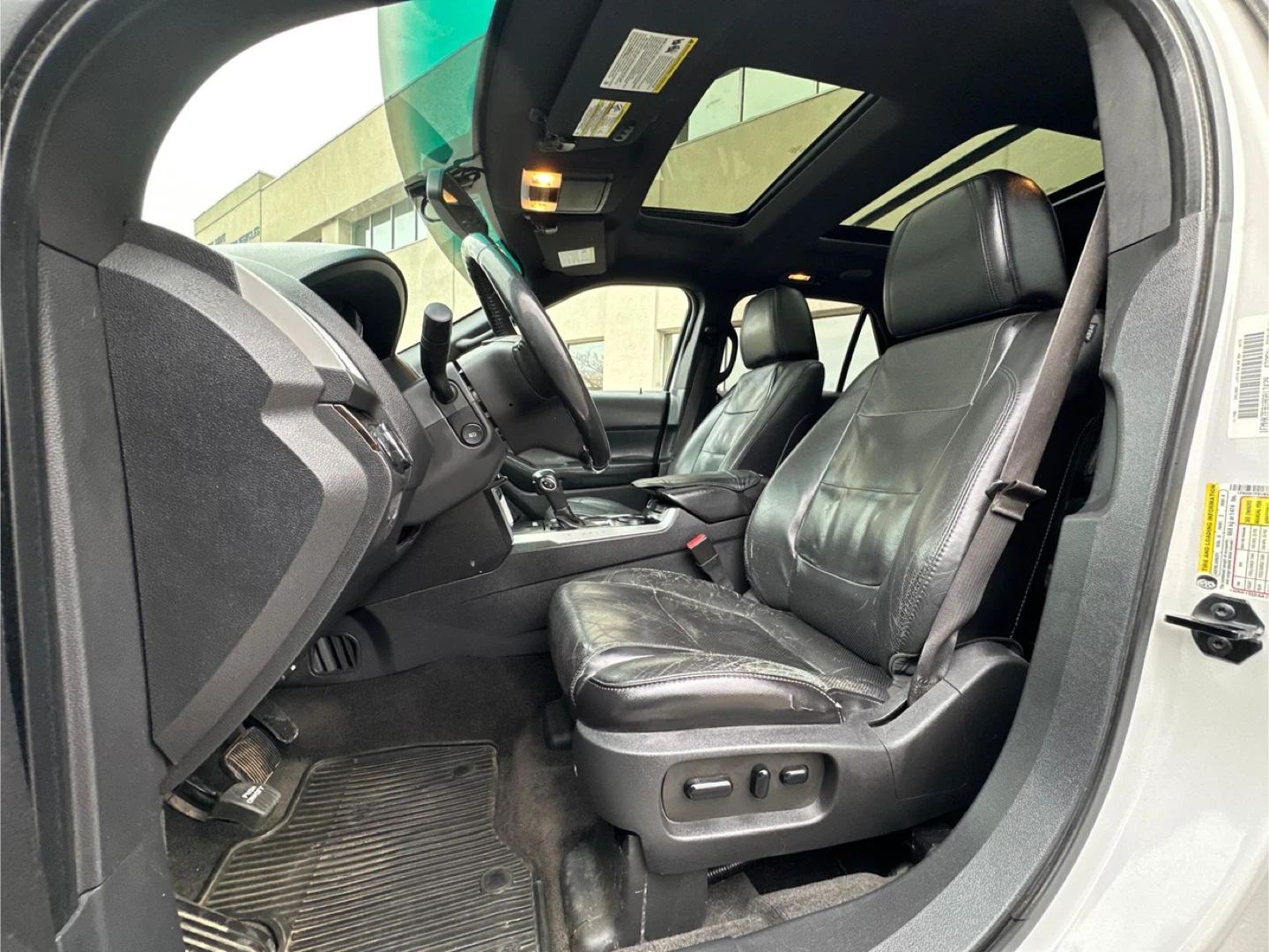 Selling a white Ford Explorer Limited SUV. It has a sunroof and black leather interior. The car shows signs of wear on the driver's seat. 100,000 miles, Clea Title, negotiable, test drive available