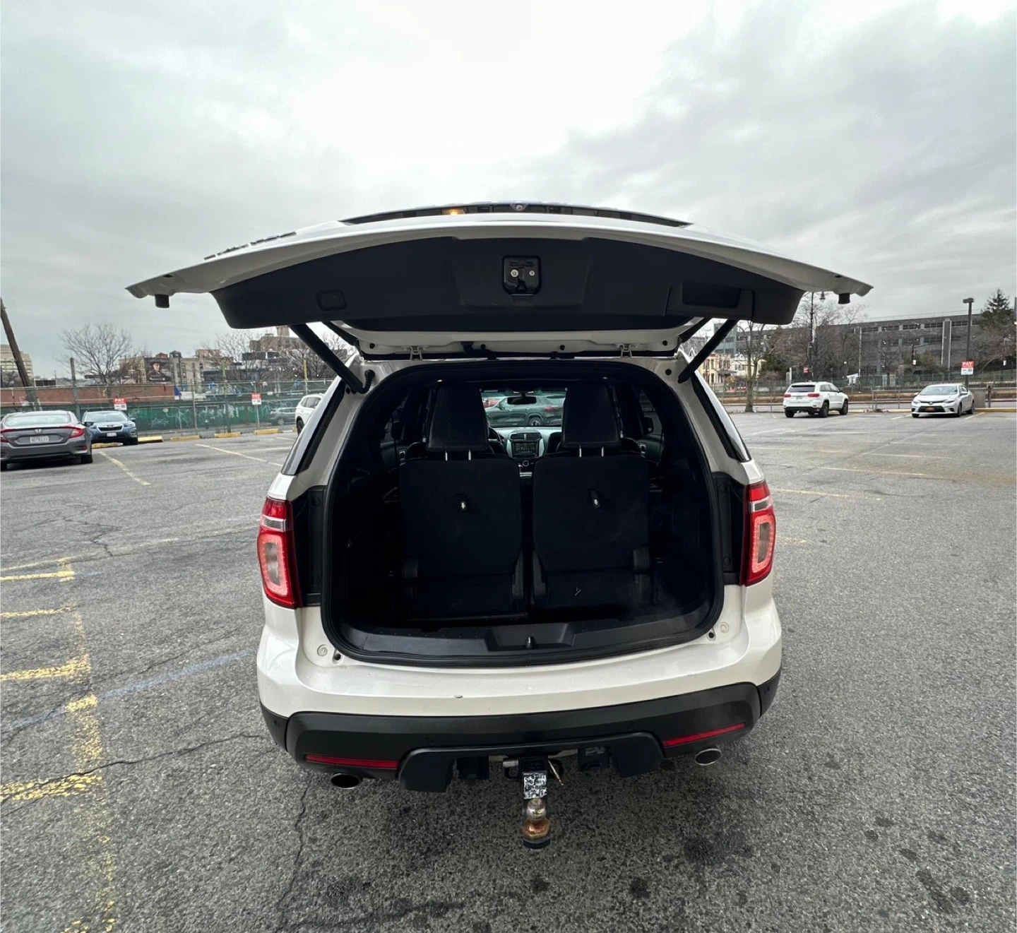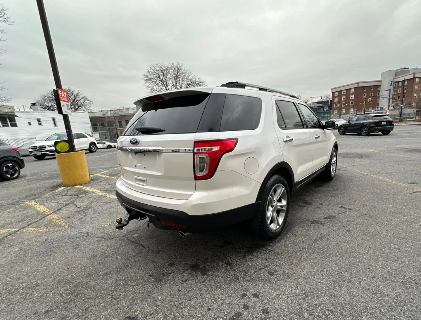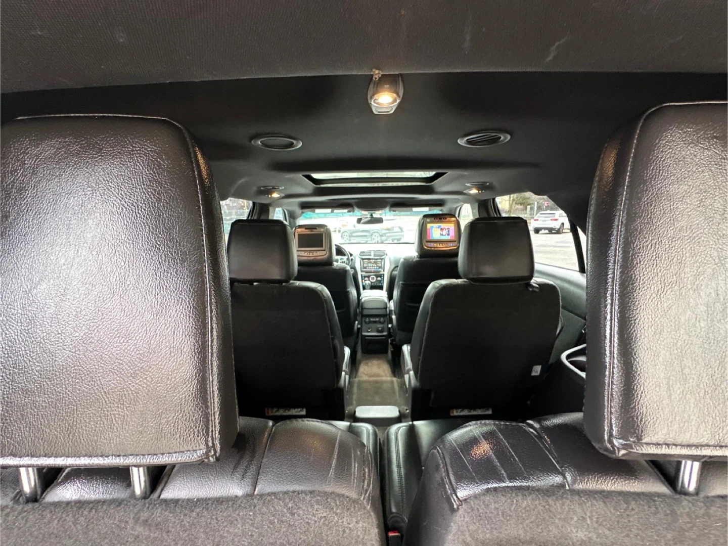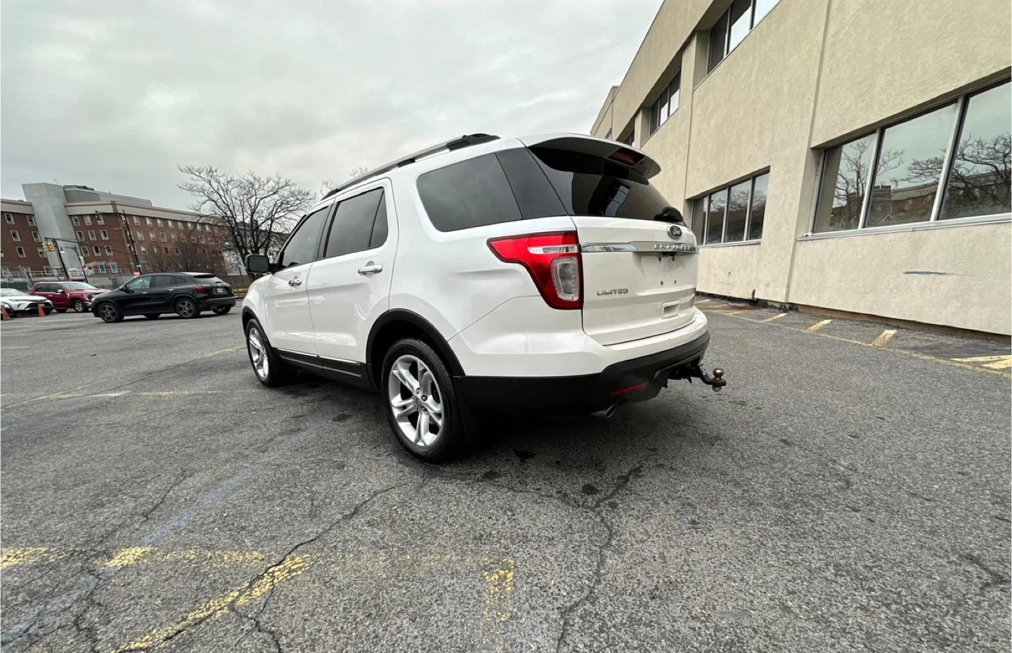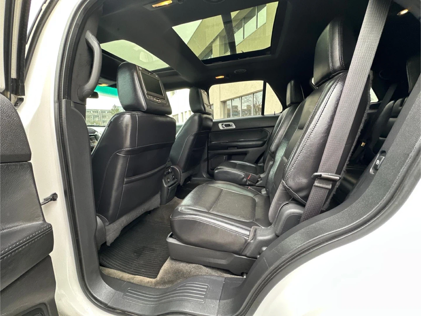 Selling a white Ford Explorer Limited SUV. It has a sunroof and black leather interior. The car shows signs of wear on the driver's seat. 100,000 miles, Clea Title, negotiable, test drive available