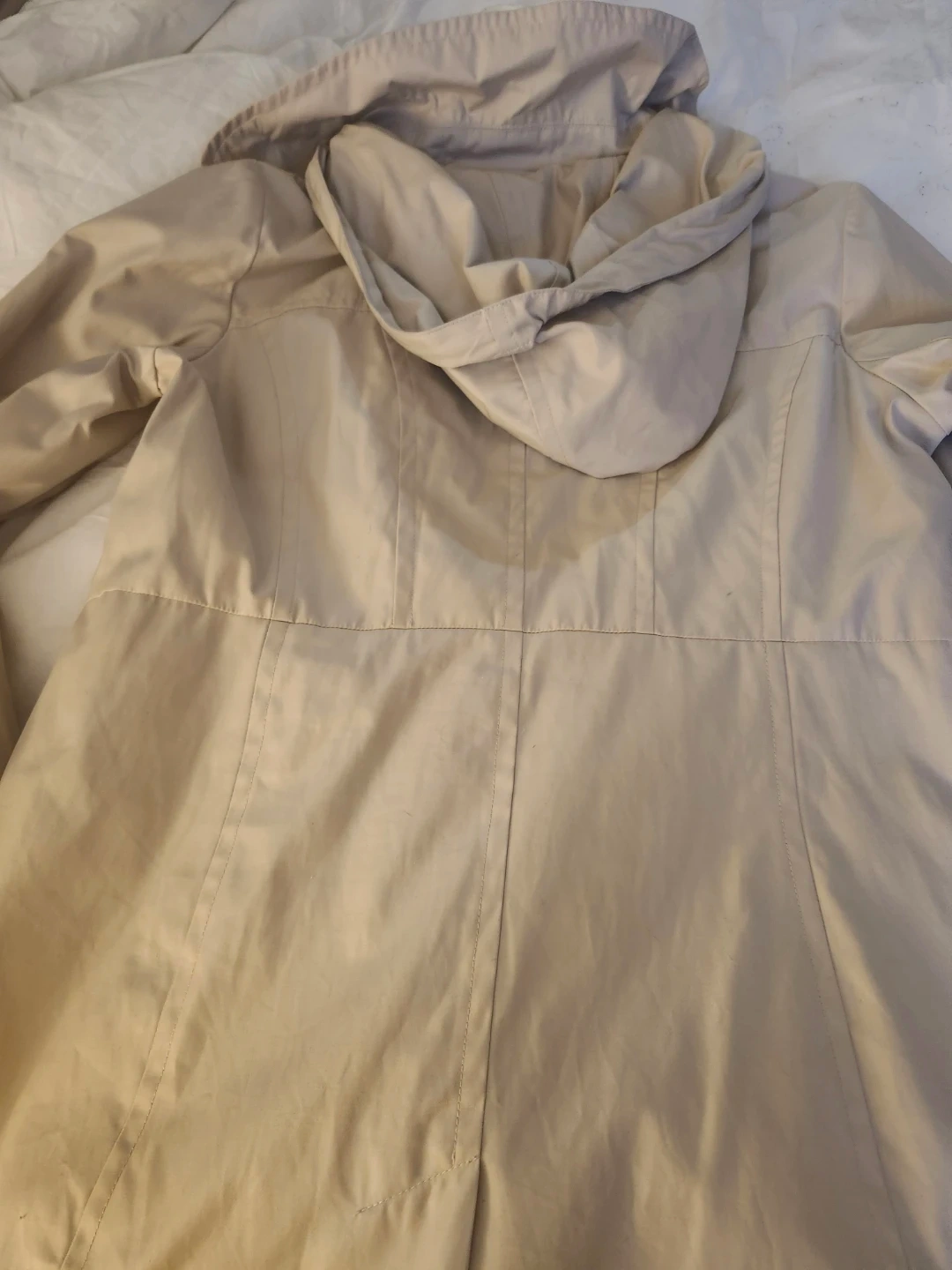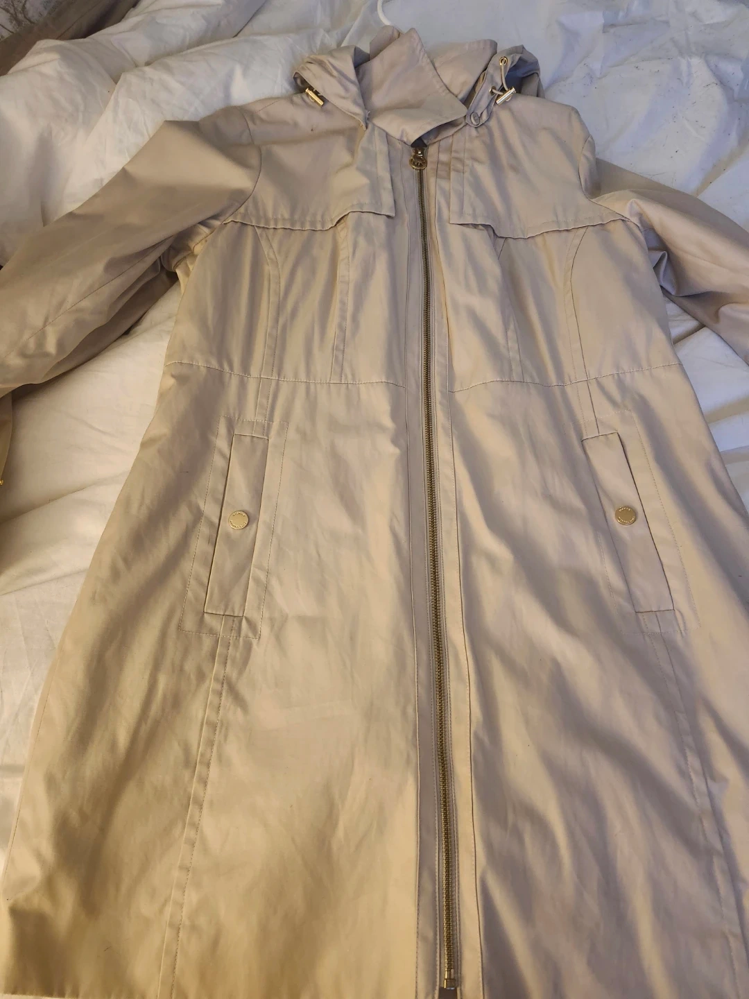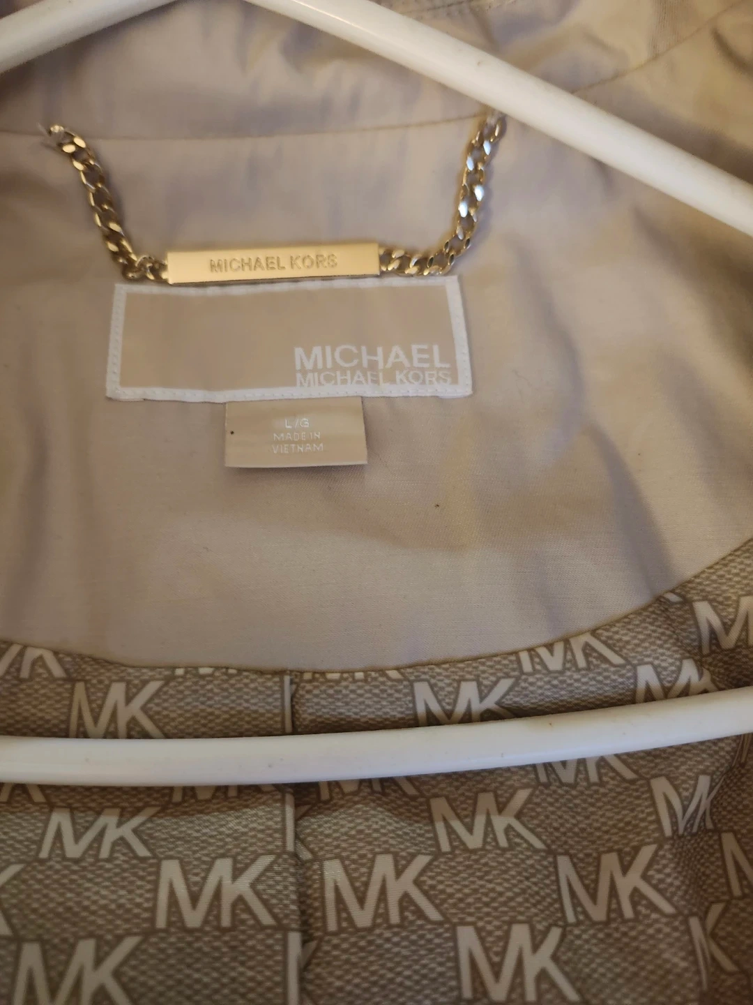 Here's a stylish beige spring coat from Michael Kors! It's a size large and would be perfect for those drizzly days. The coat features the MK logo pattern on the inside lining. Originally bought for $275 plus tax. This one has the hood included. Gold detailed buttons. Open to reasonable offers.Only worn a few times.