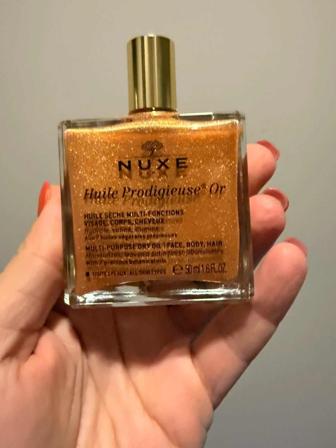 Selling a bottle of Nuxe Huile Prodigieuse Or multi-purpose dry oil! This is a multi-function dry oil for face, body, and hair. It moisturizes, leaves a satin finish, and illuminates. It's suitable for all skin types and comes in a 50ml (1.6 fl oz) bottle