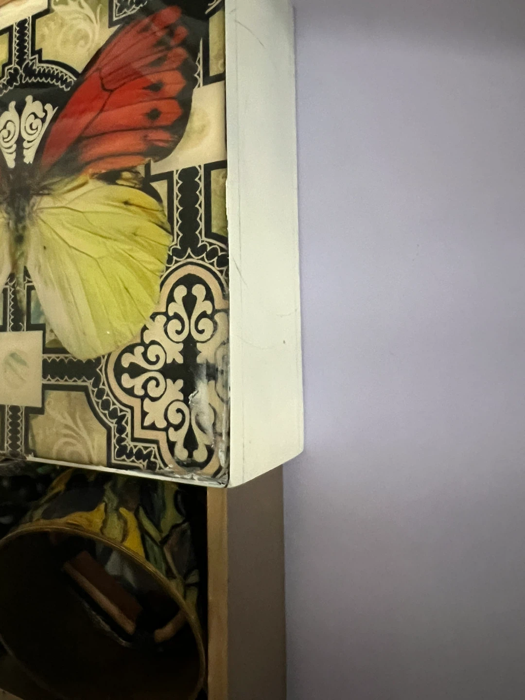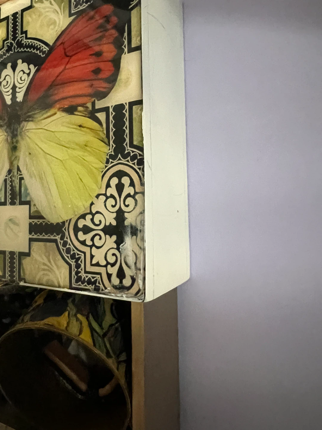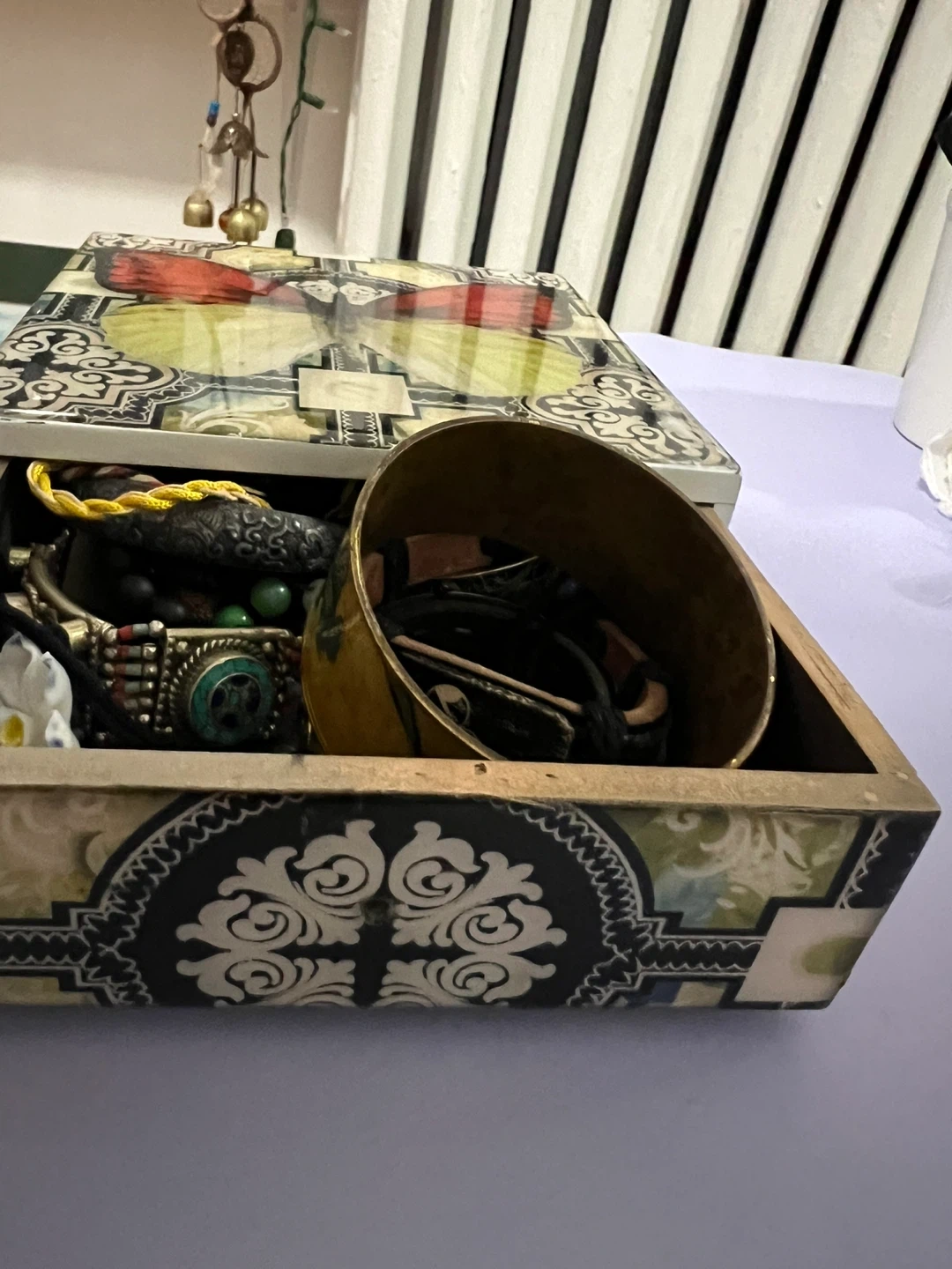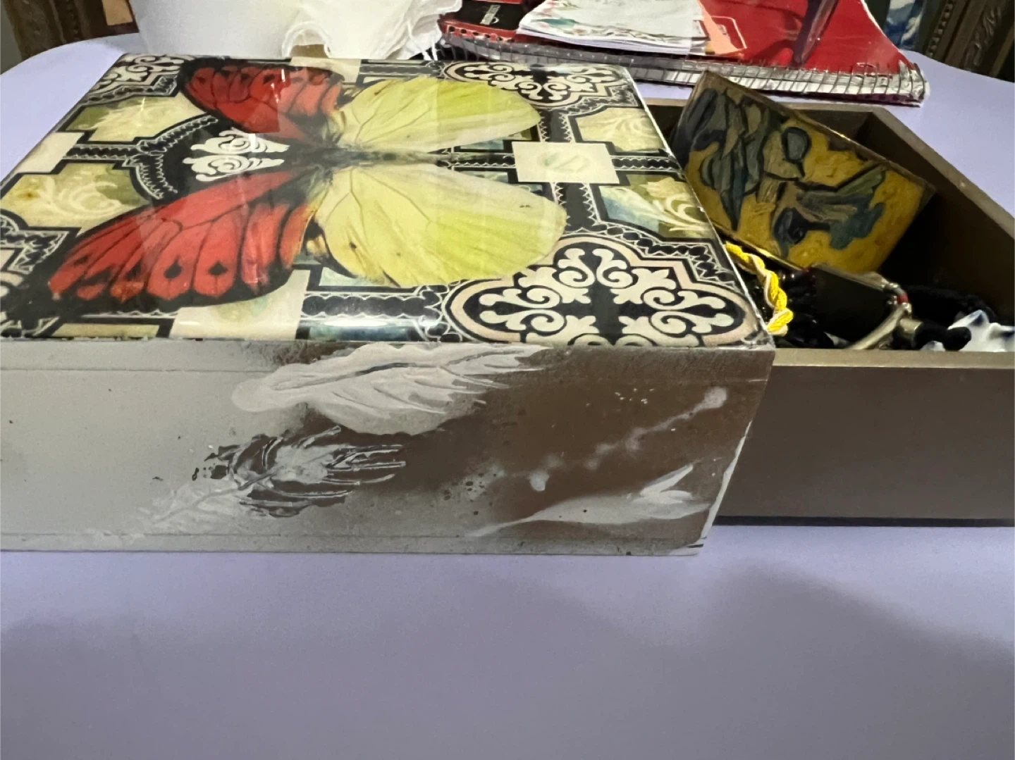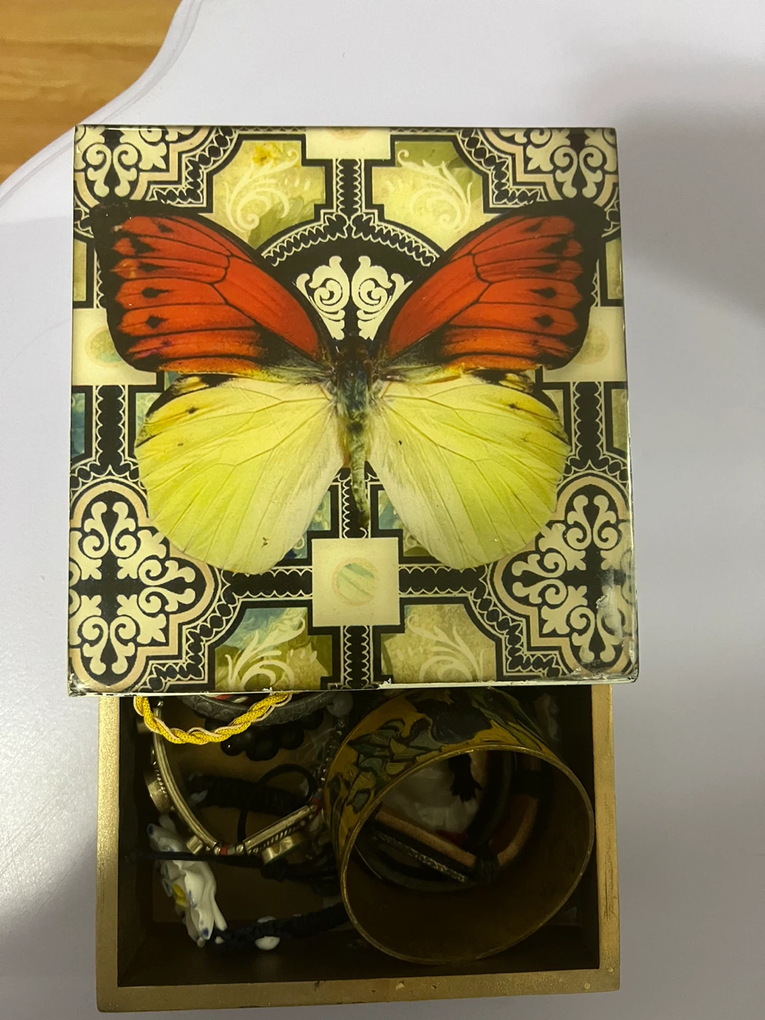 Selling this decorative jewelry box with a butterfly design on the lid. It's perfect for storing your favorite accessories and adding a touch of charm to your space. The box has a unique pattern and is in good condition.