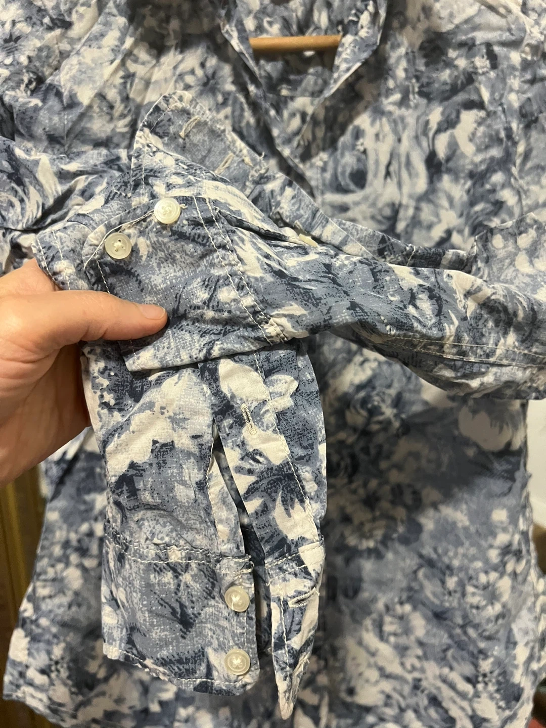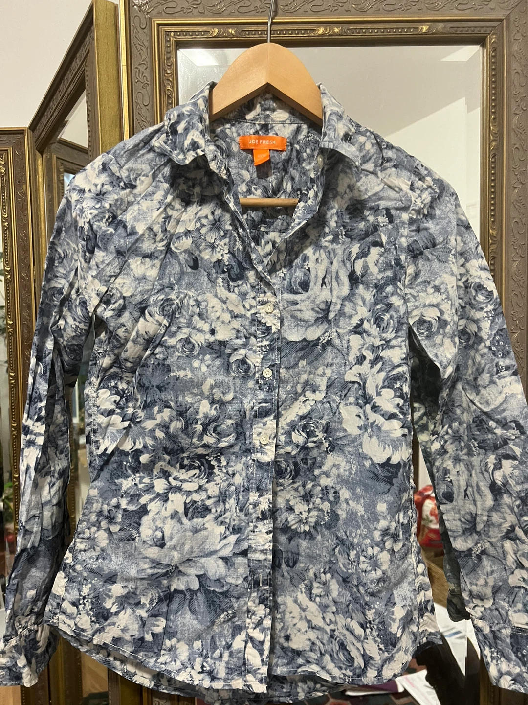This is a stylish floral button-down shirt from Joe Fresh. The shirt features a beautiful floral pattern in shades of blue and white. It's perfect for adding a touch of elegance to your wardrobe!