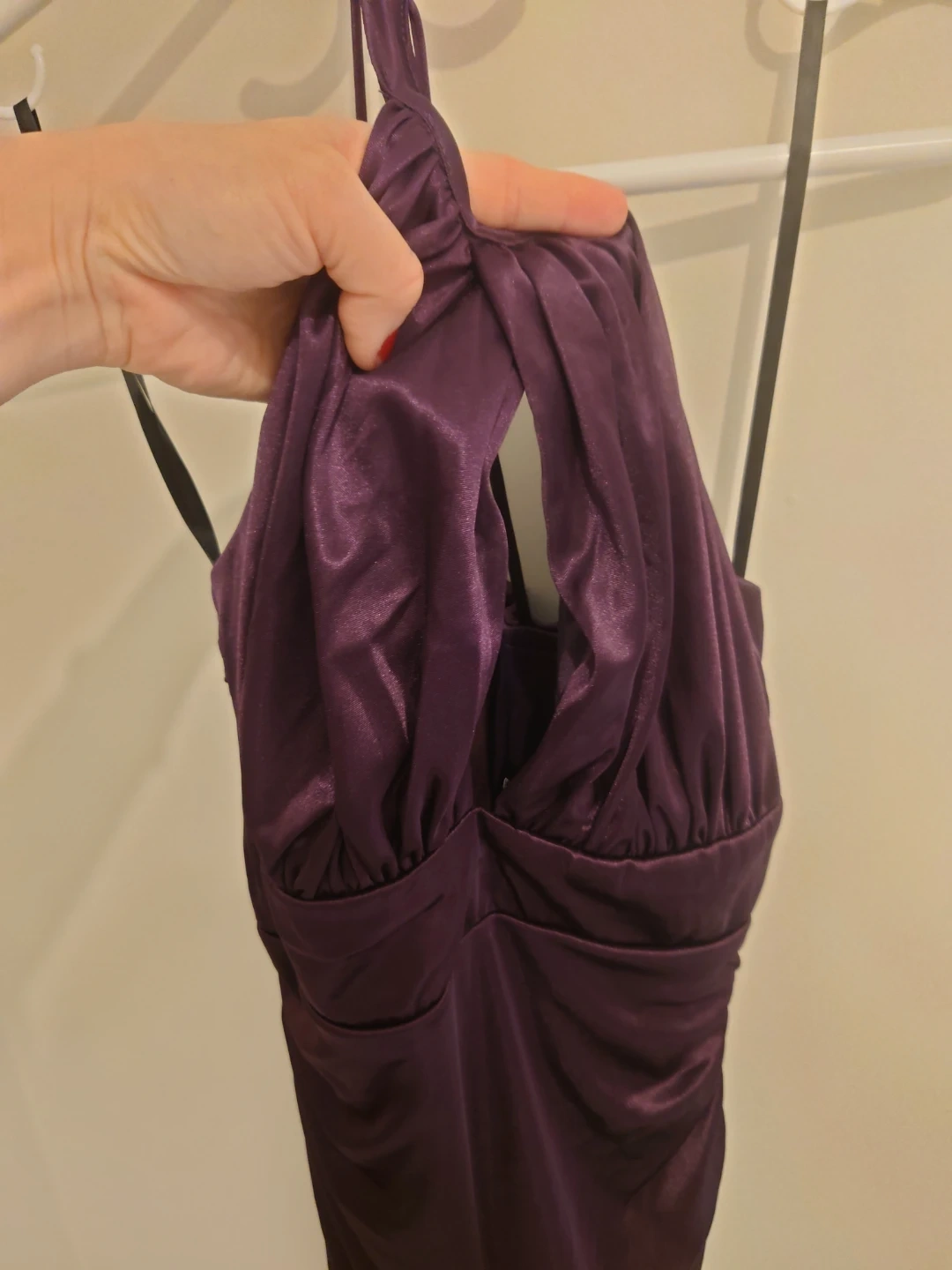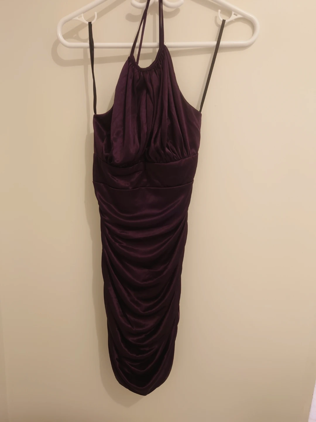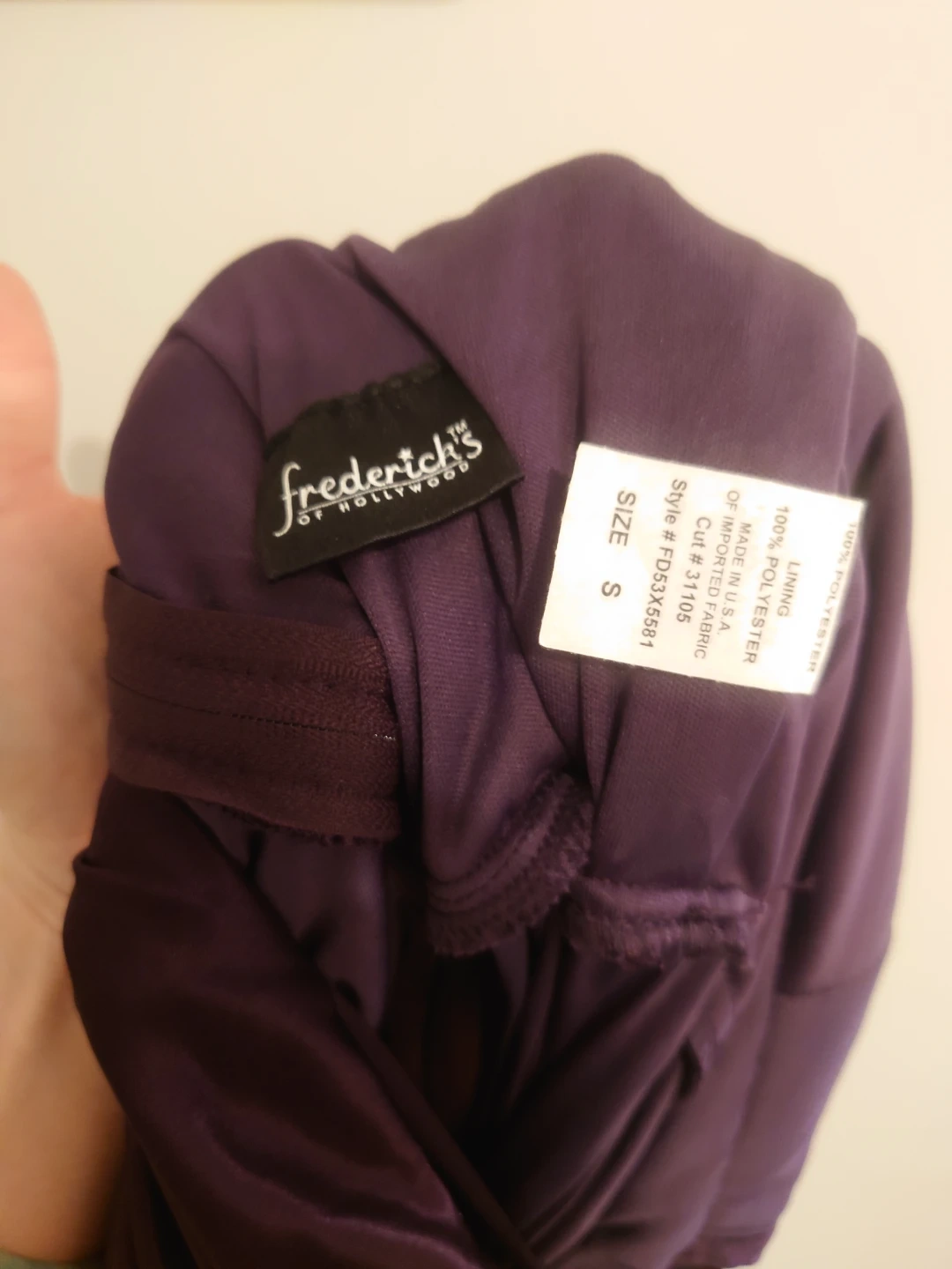 Selling a Frederick's of Hollywood dress in a beautiful purple colour! It's a size small and made of 100% polyester. The style # is FDE3X55881 and cut # is 31105