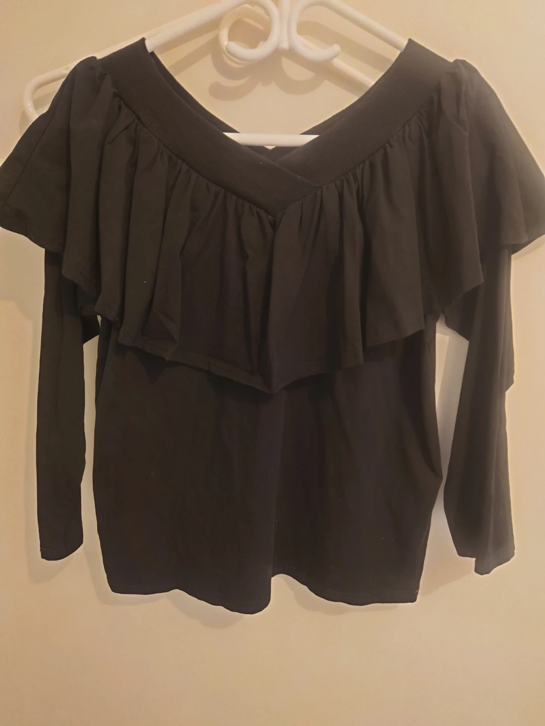 A cute black long-sleeve top with a ruffle detail. It's in great condition and ready for a new wardrobe!