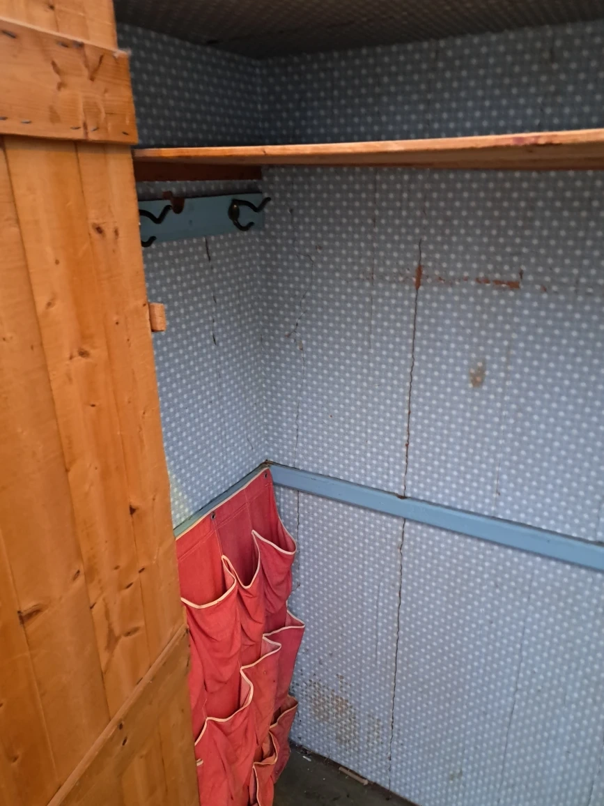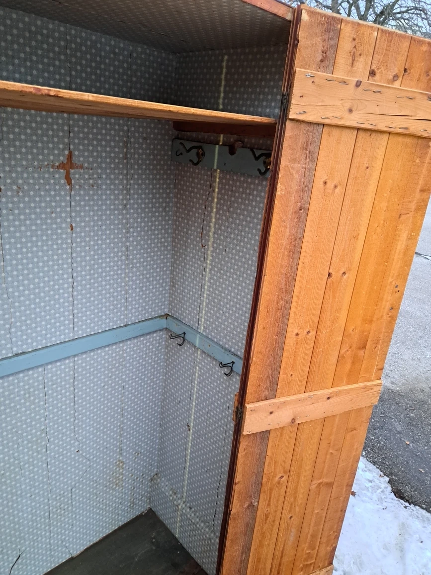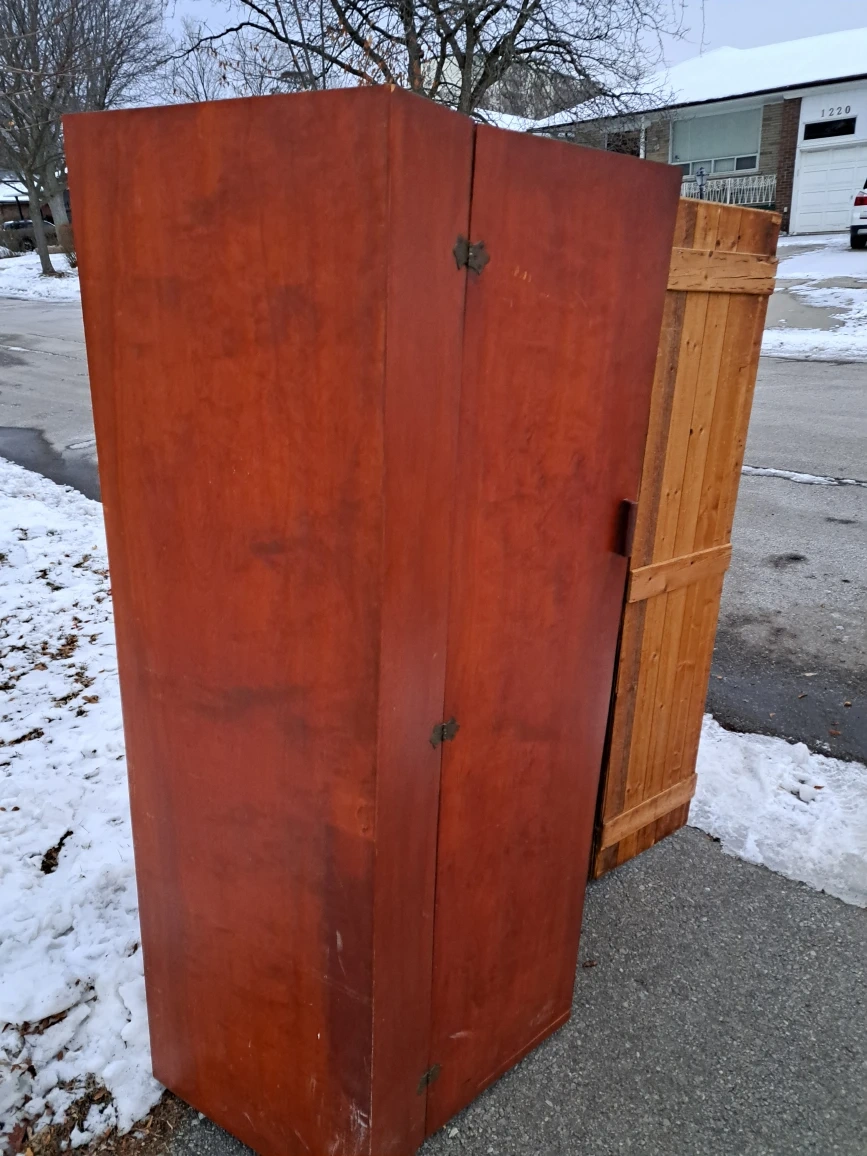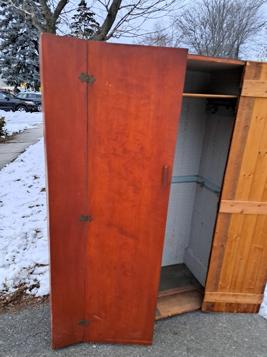 Solid wood wardrobe. Approximately 4 feet wide, 6 feet tall, 18-24 inches deep. On wheels. At least 40 years old. Pick up only
