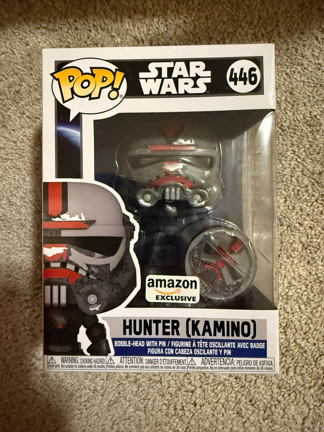 Selling a Funko Pop! Star Wars figure of Hunter from Kamino. This is number 446 in the series and an Amazon exclusive! It's a bobble-head with a pin/badge