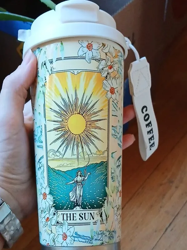 This is a coffee tumbler with a tarot card design, specifically 'The Sun'. It has a cute little tag that says 'Coffee'. Perfect for your morning brew!