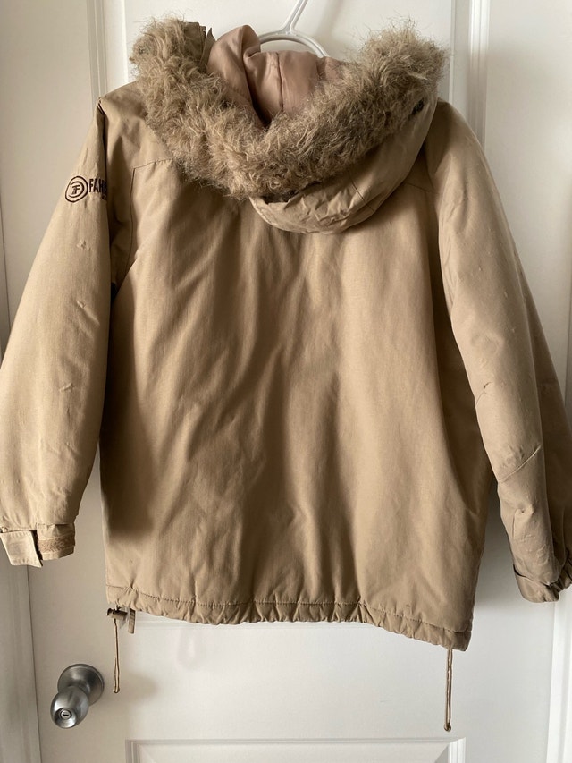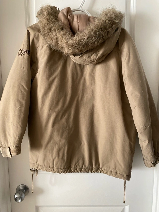 Get ready to brave the cold with this stylish Fabianni jacket, perfect for chilly days and outdoor adventures! This jacket is in used condition and shows signs of wear. Key features: - Brand: Fahrenheit - Size: 14/16 - Colour: Khaki - Faux fur trim on hood. This jacket has been well-loved but still has plenty of warmth and style to offer!