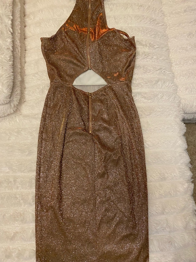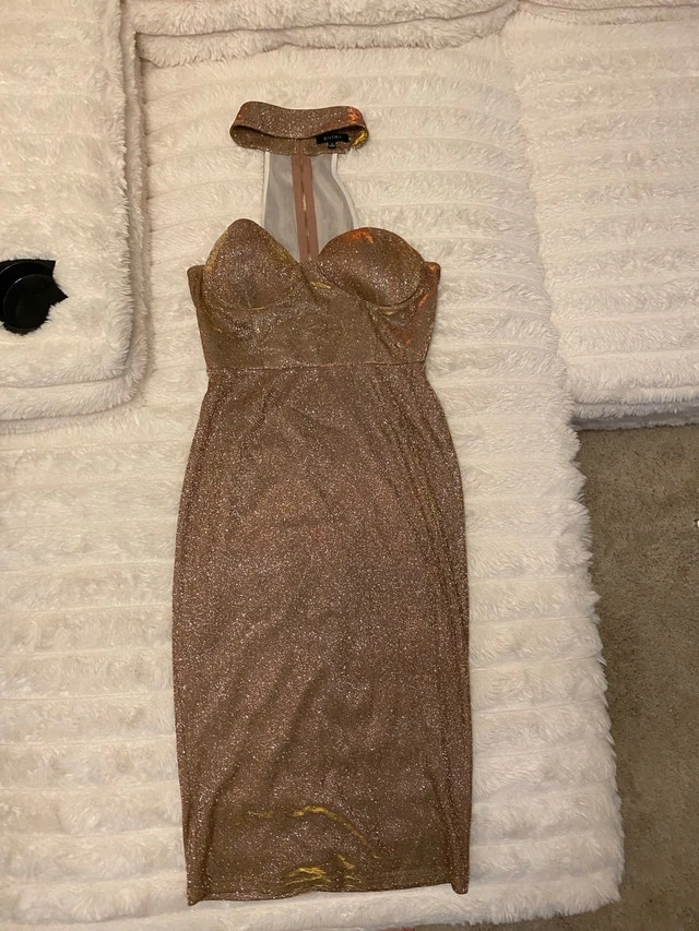 Shine bright in this sparkly bronze dress! It's a phantom halter-style (choker) bodycon dress, perfect for a night out. Impulse buy and I’ve only tried it on but never wore it anywhere. Perfect for a night out, Christmas party or a special event. * Small * Bodycon Fit * Bronze Sparkle Finding the perfect dress is like finding the last piece of the puzzle – it just clicks! And just like this ad, if it's still up, the dress is still available!