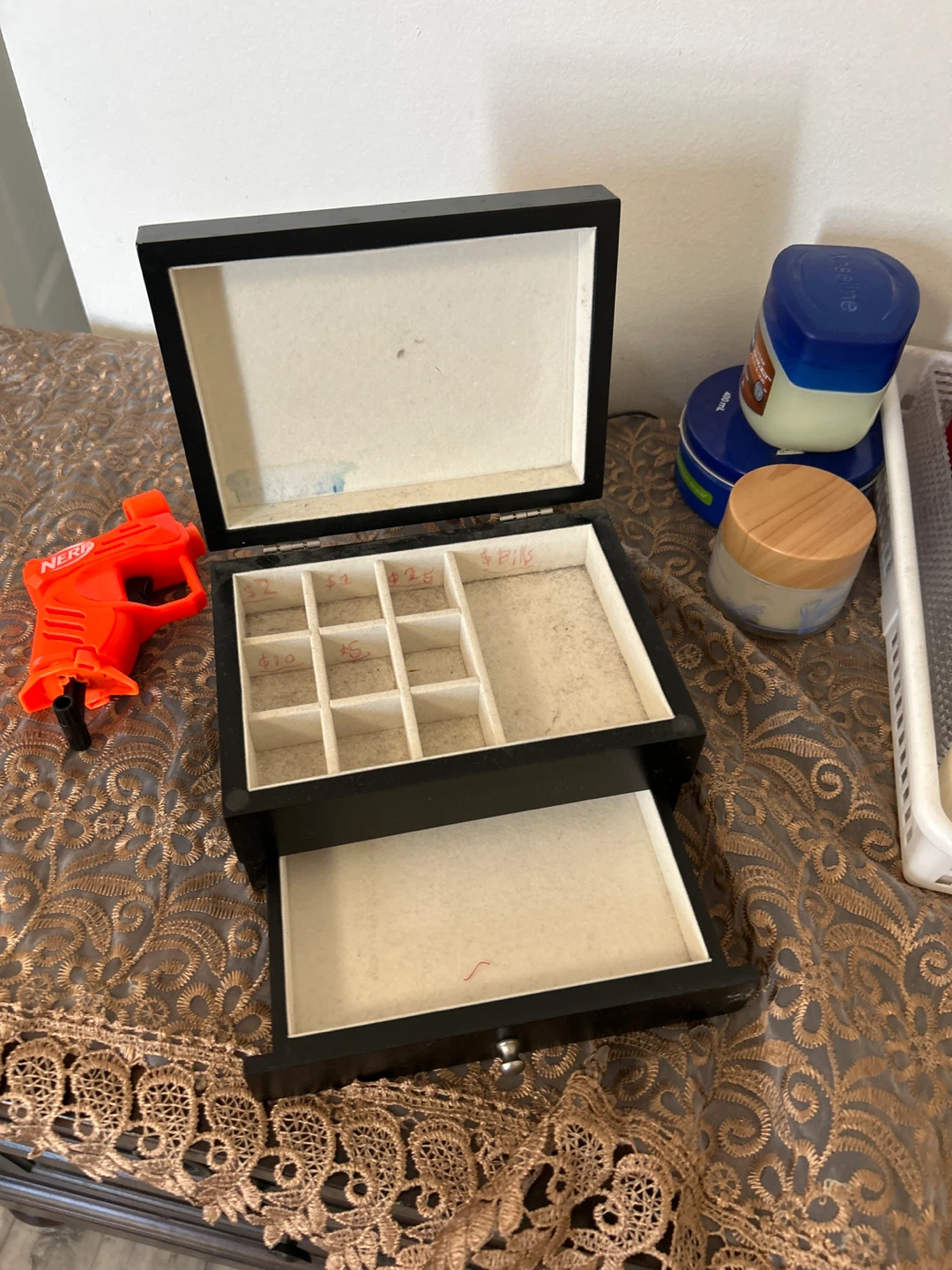 Selling a black wooden jewelry box. It has a drawer and multiple compartments for organizing your jewelry. It's in good condition and ready for a new owner!