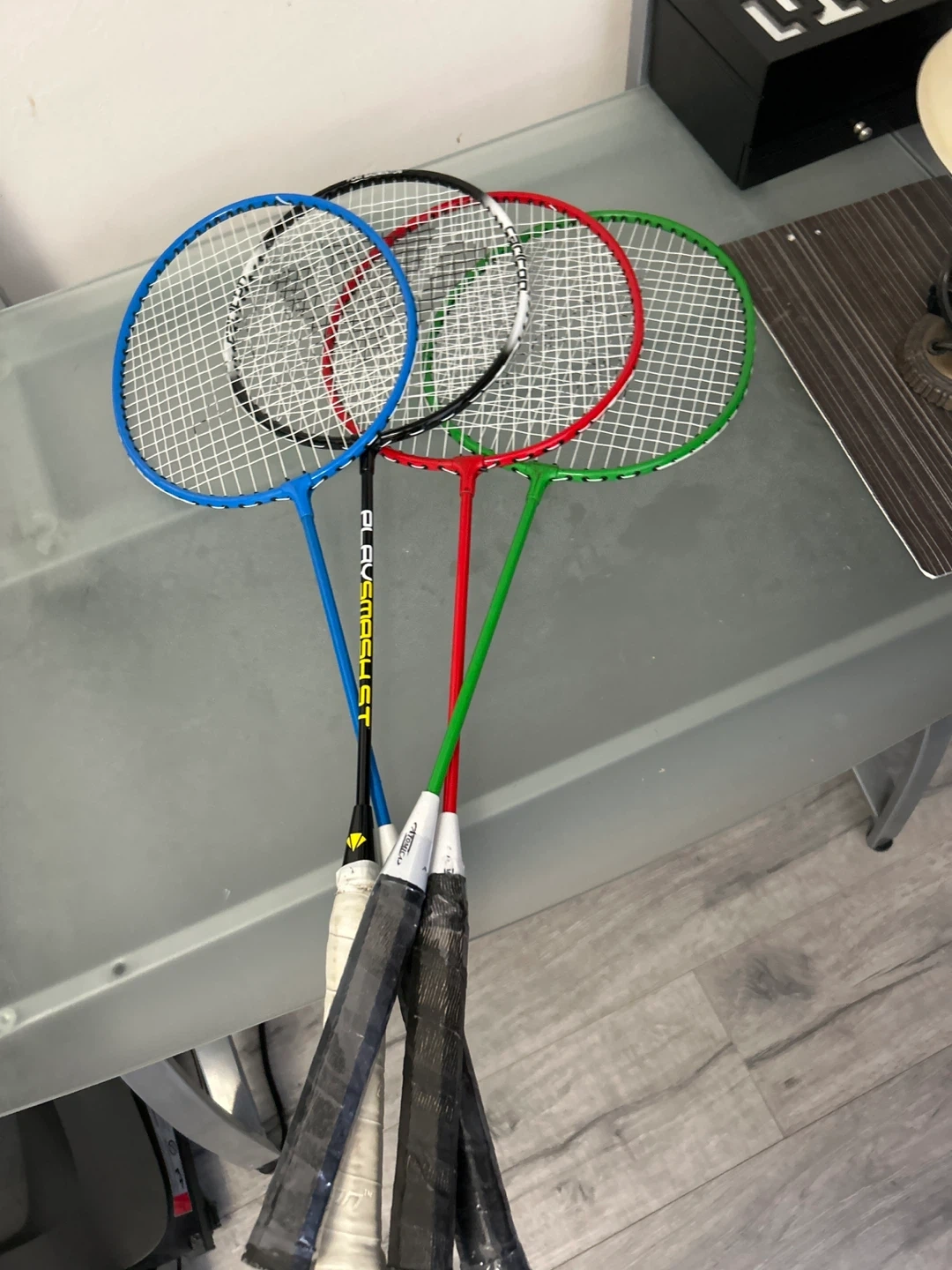 Selling a set of four badminton rackets. They come in a variety of colours: blue, black, red, and green. Perfect for some fun games with friends and family!