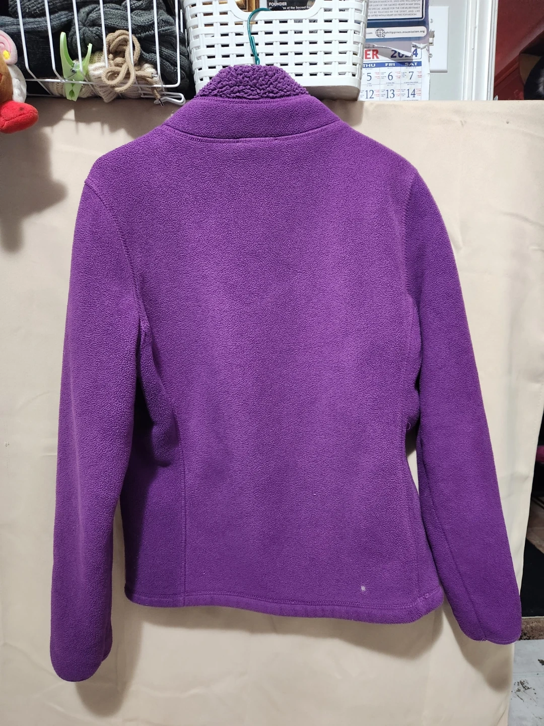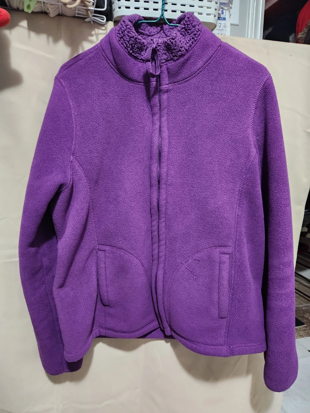 Selling a cozy purple jacket! It's in great condition and perfect for layering on chilly days. The jacket is soft and warm, making it super comfortable to wear. It has a full zipper and two handy pockets in the front