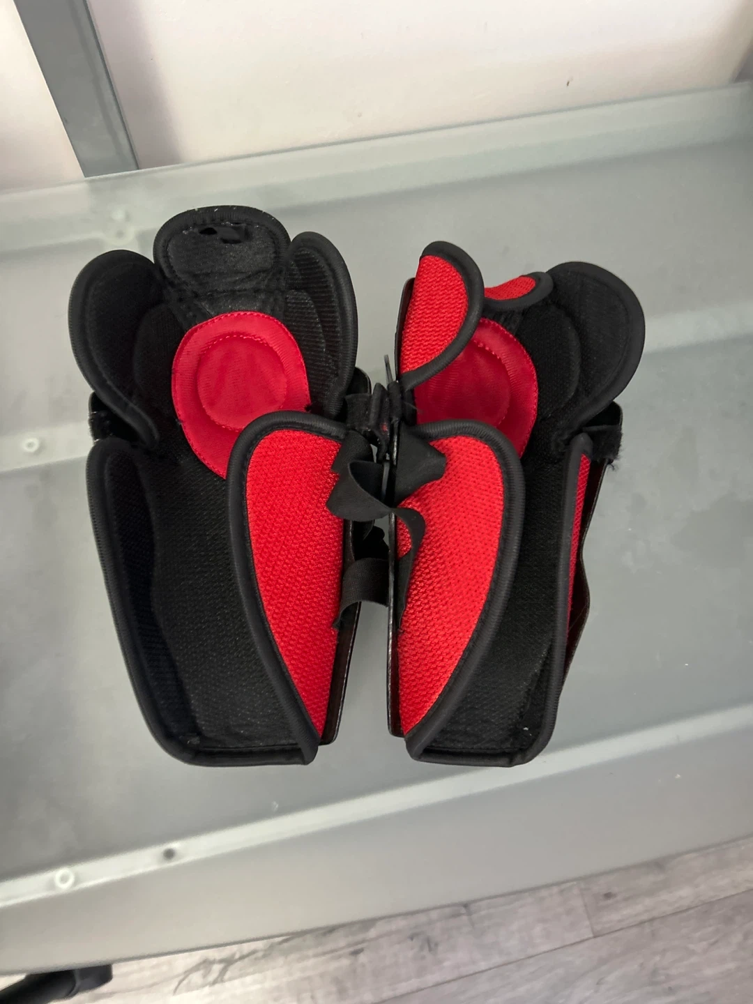 Here are Bauer hockey shin guards in great condition! They are 9 inches and feature a red and black design. Perfect for protecting your shins on the ice