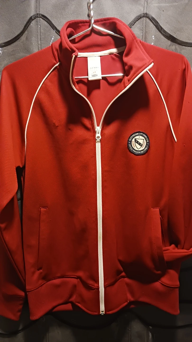 Here's a cool red track jacket from Old Navy! It's a size small but it fits like a M to L... and in great condition. Perfect for layering or wearing on its own.