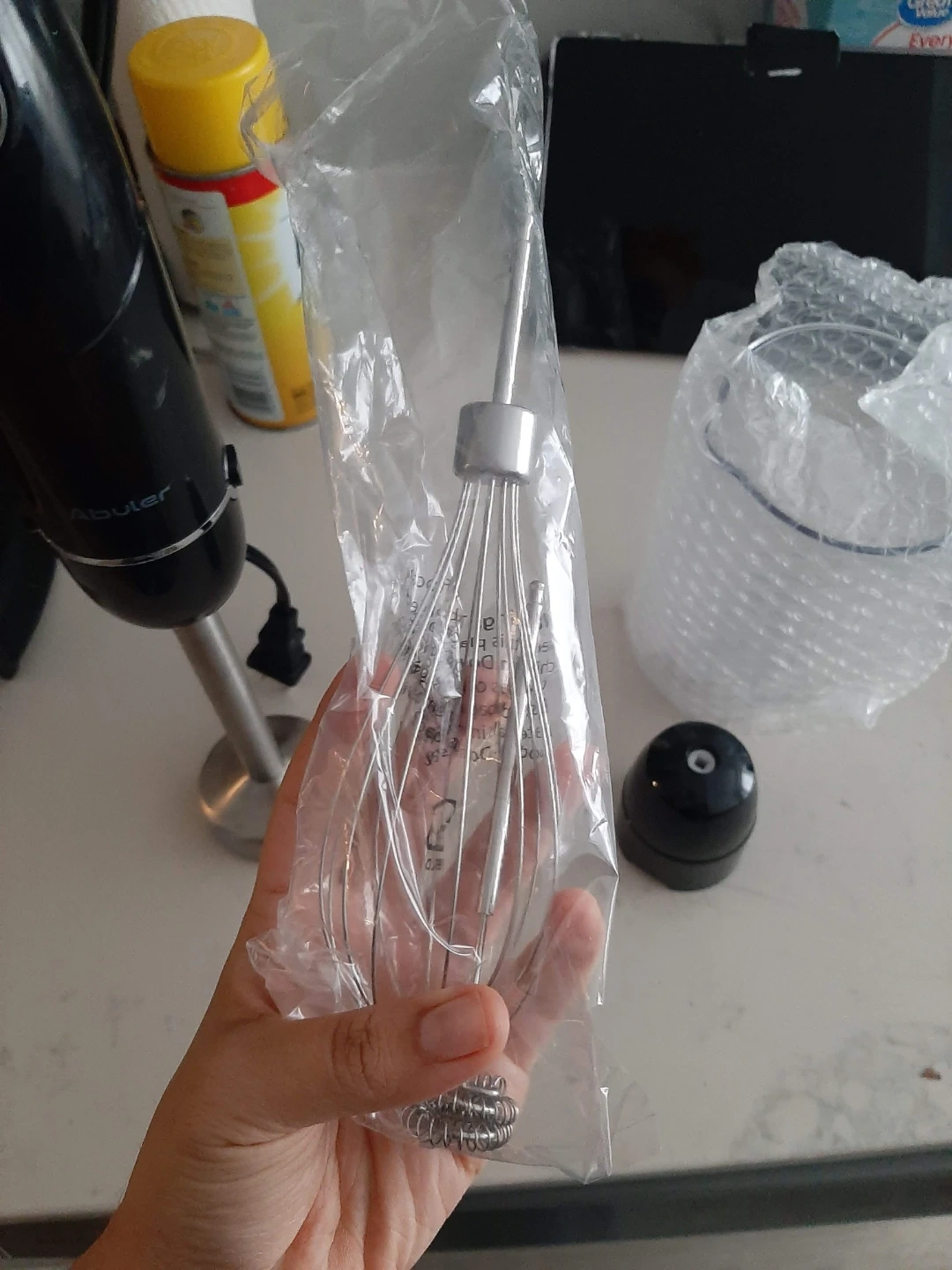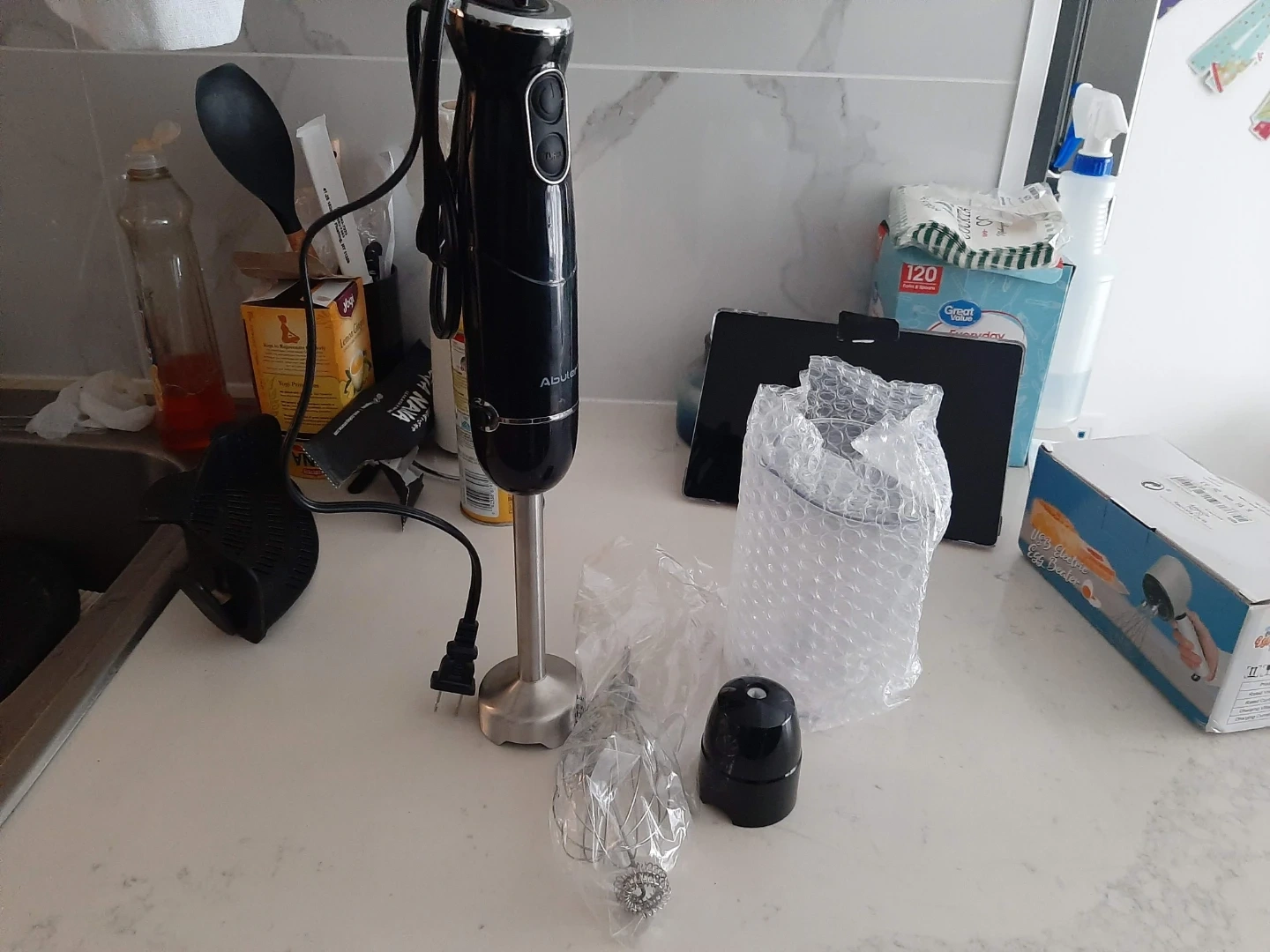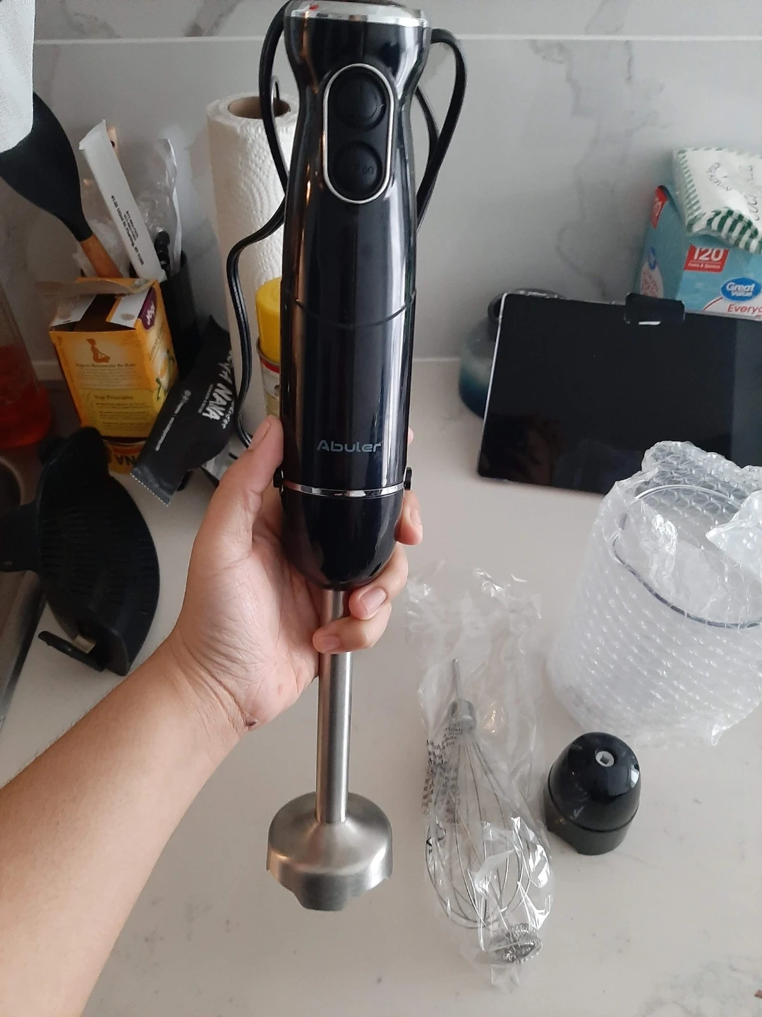 I'm selling an Abuler immersion hand blender. It's in new condition and comes with all the original components. This is perfect for making smoothies, soups, and sauces. The blender is lightweight and portable, making it easy to store and use. It also includes a box.