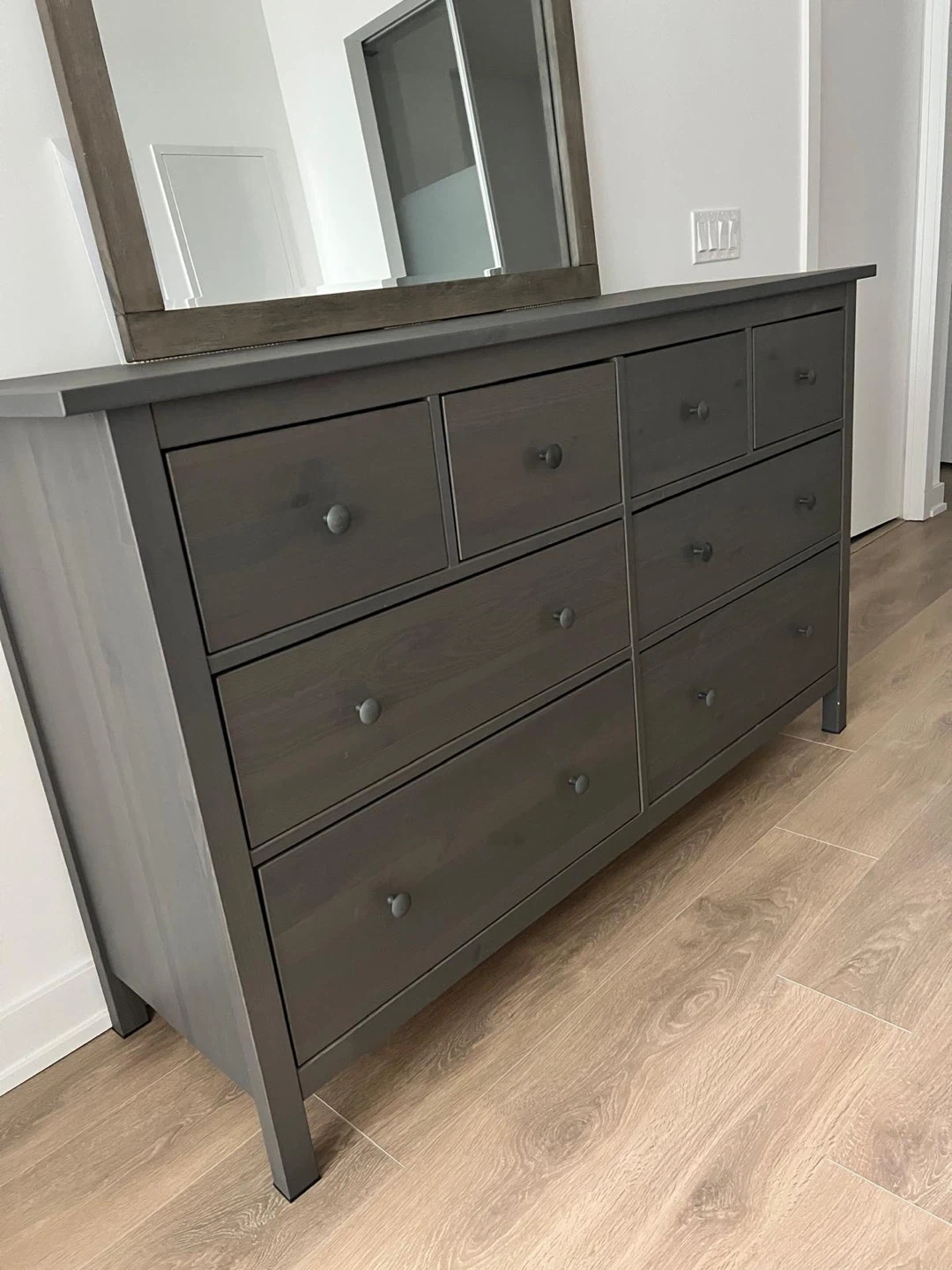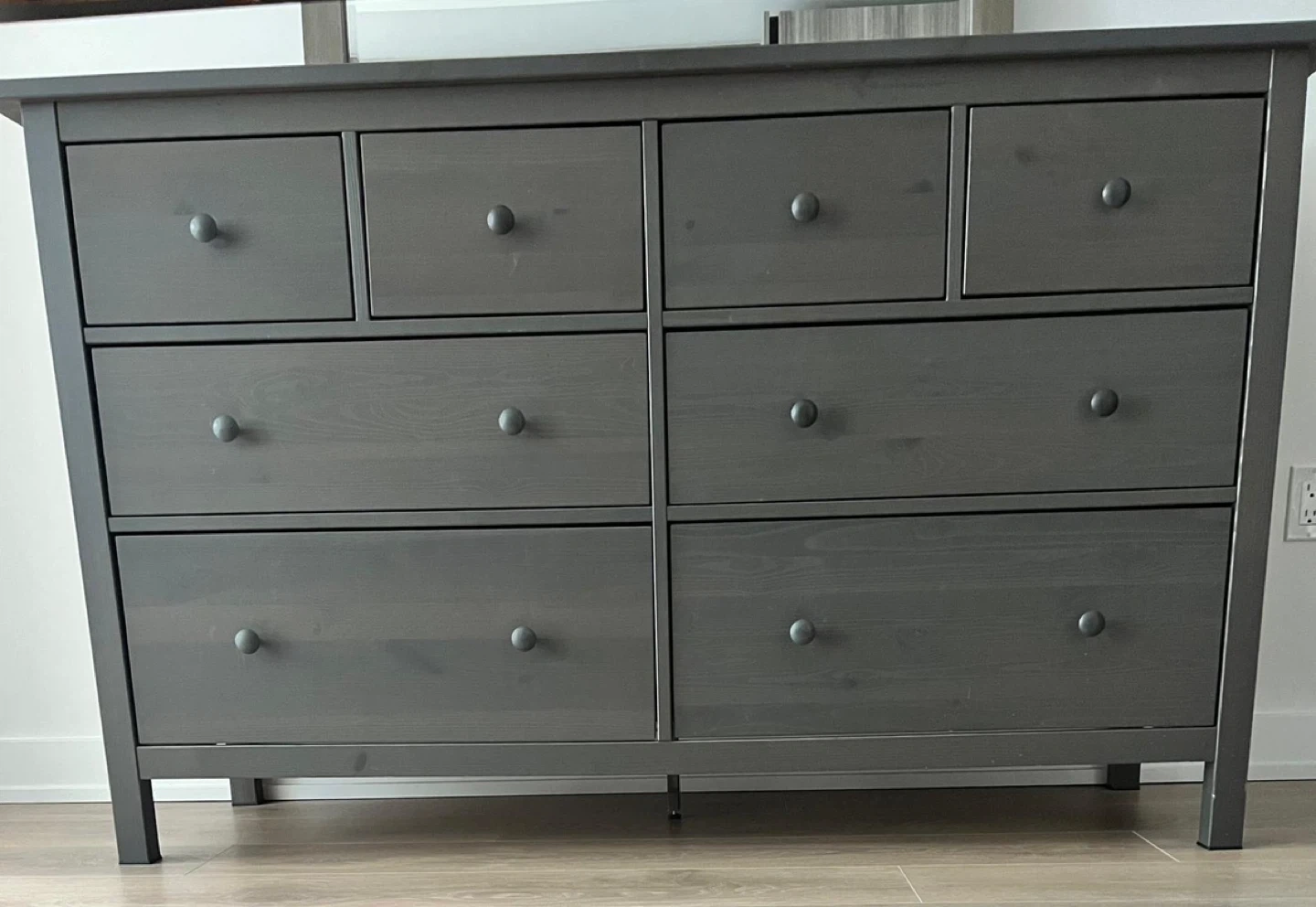 Selling a grey IKEA Hemnes dresser with 8 drawers. It's in great shape and ready for a new home. This dresser offers lots of storage space and has a classic look that fits well in any bedroom