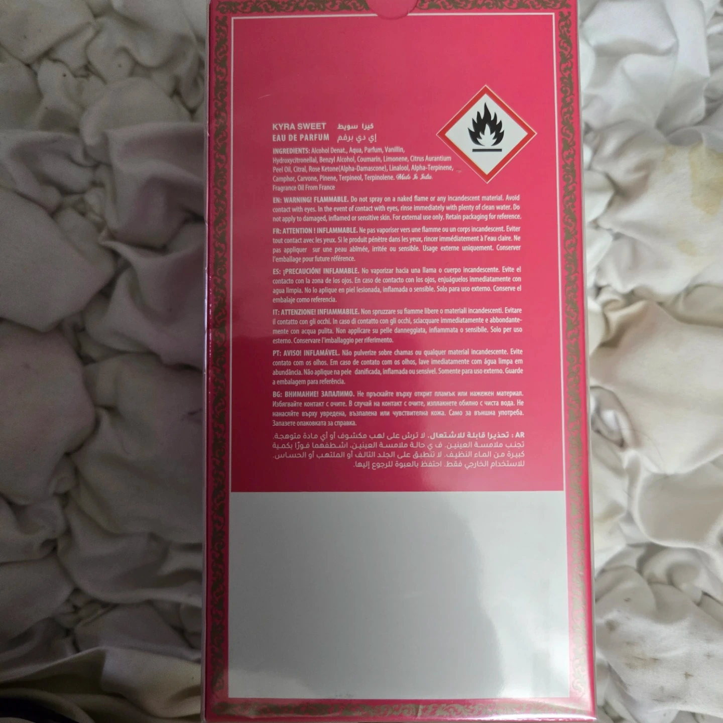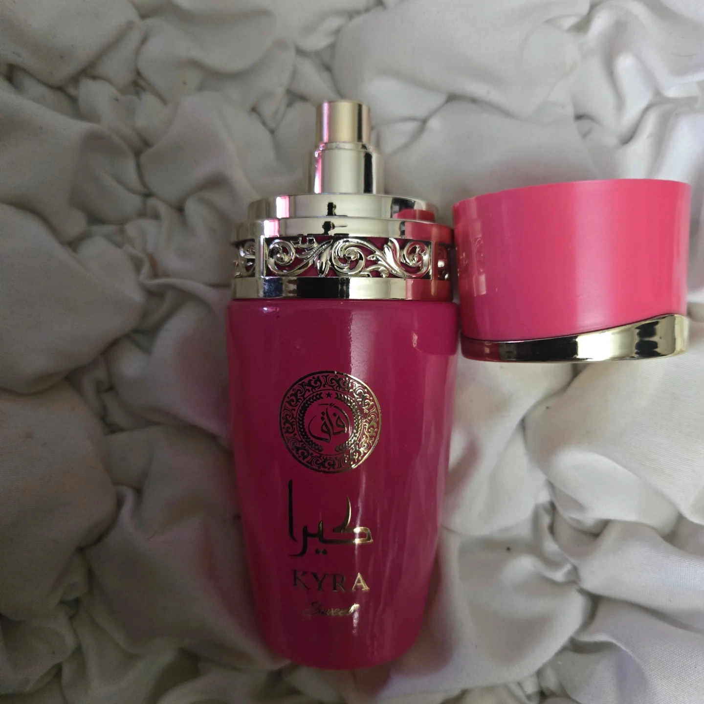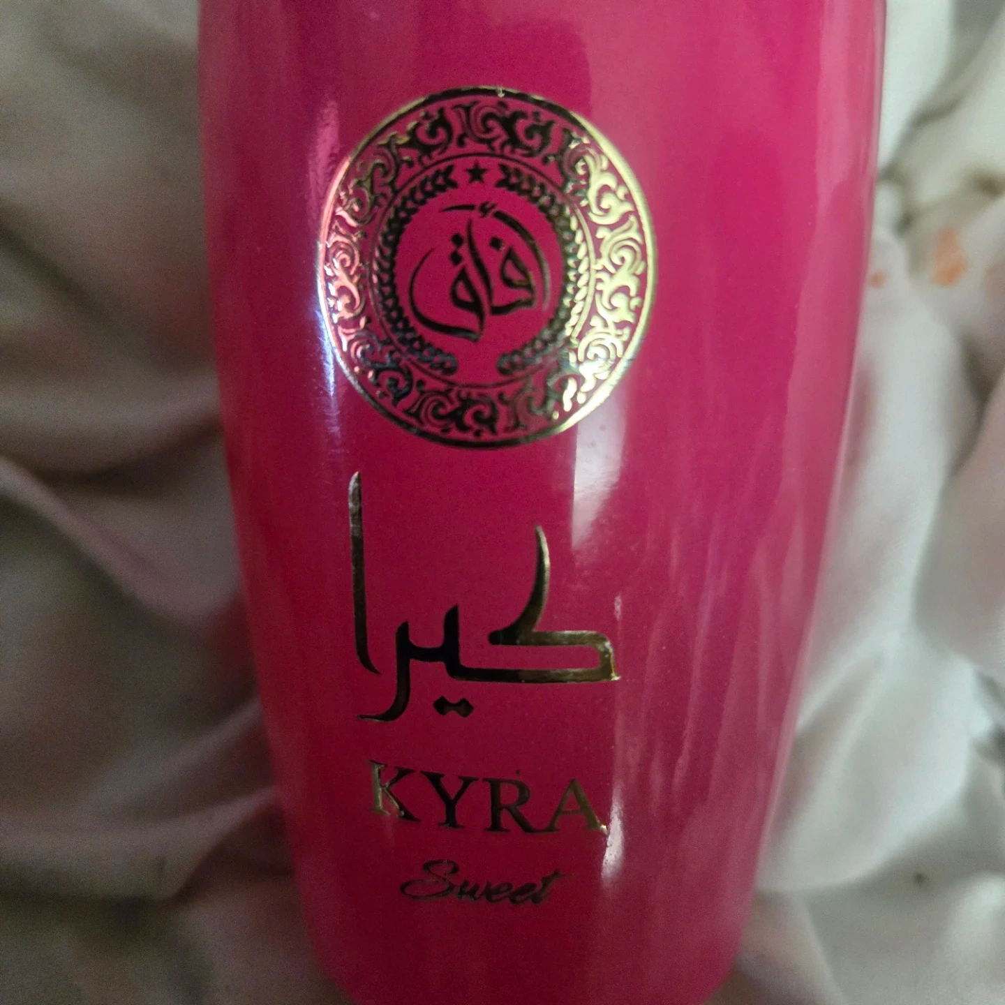 Selling a bottle of Kyra Sweet Eau de Parfum. It's a vaporisateur natural spray and contains 100ml/3.4FL.OZ. The bottle is pink with gold accents and has a beautiful floral design on the box