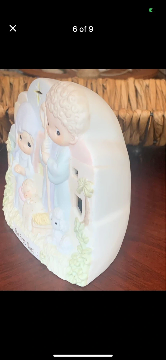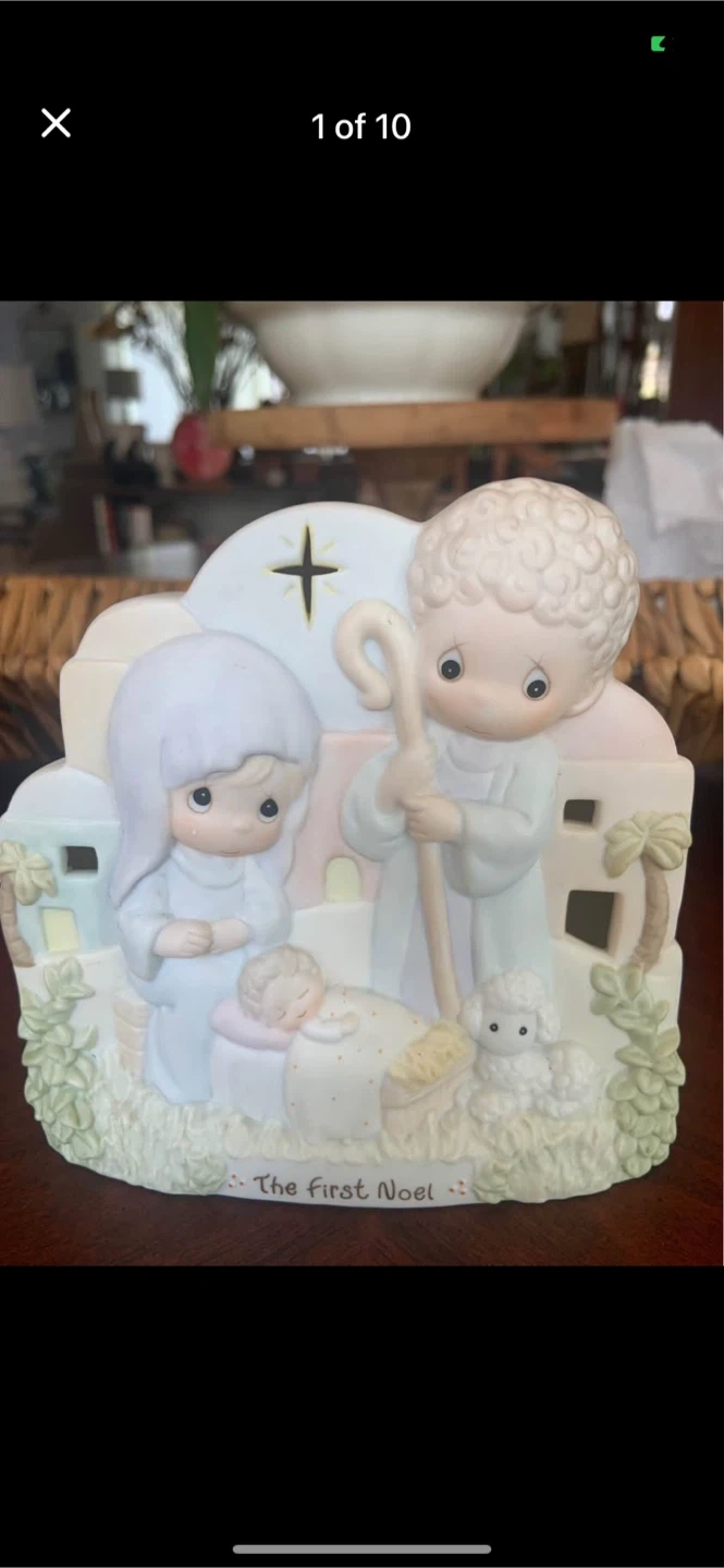 • Here's a Precious Moments figurine titled "The First Noel" depicting a nativity scene. It's in great shape and would be a lovely addition to your Christmas decorations