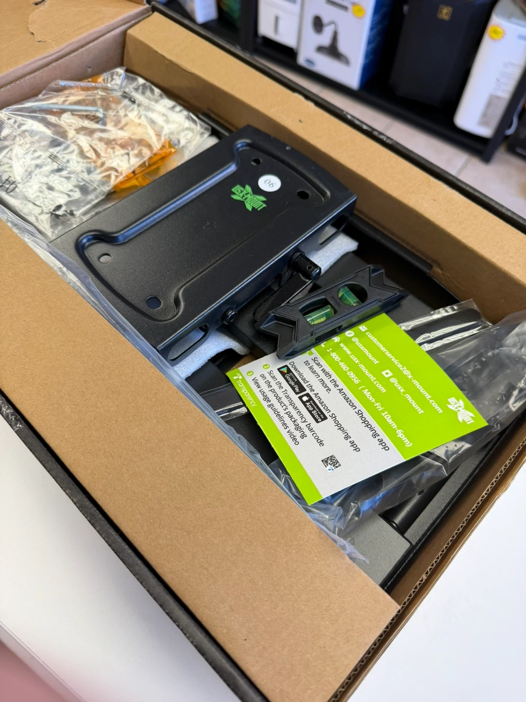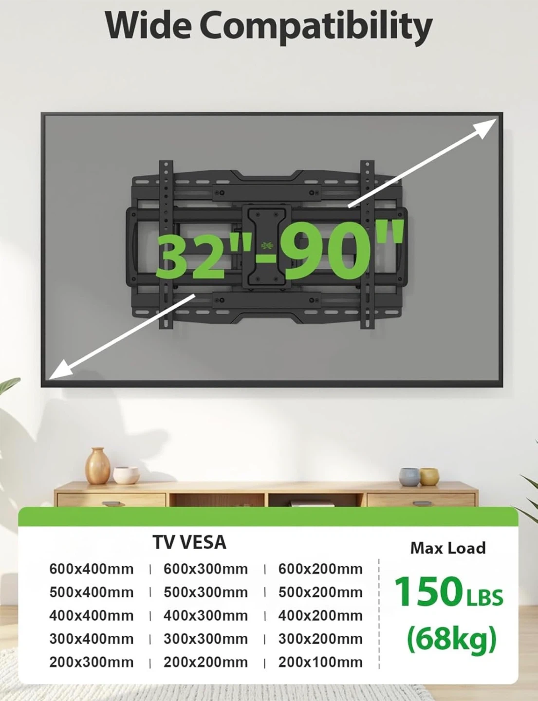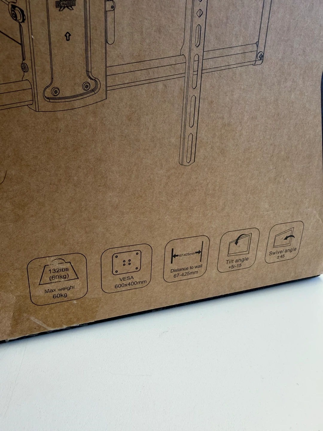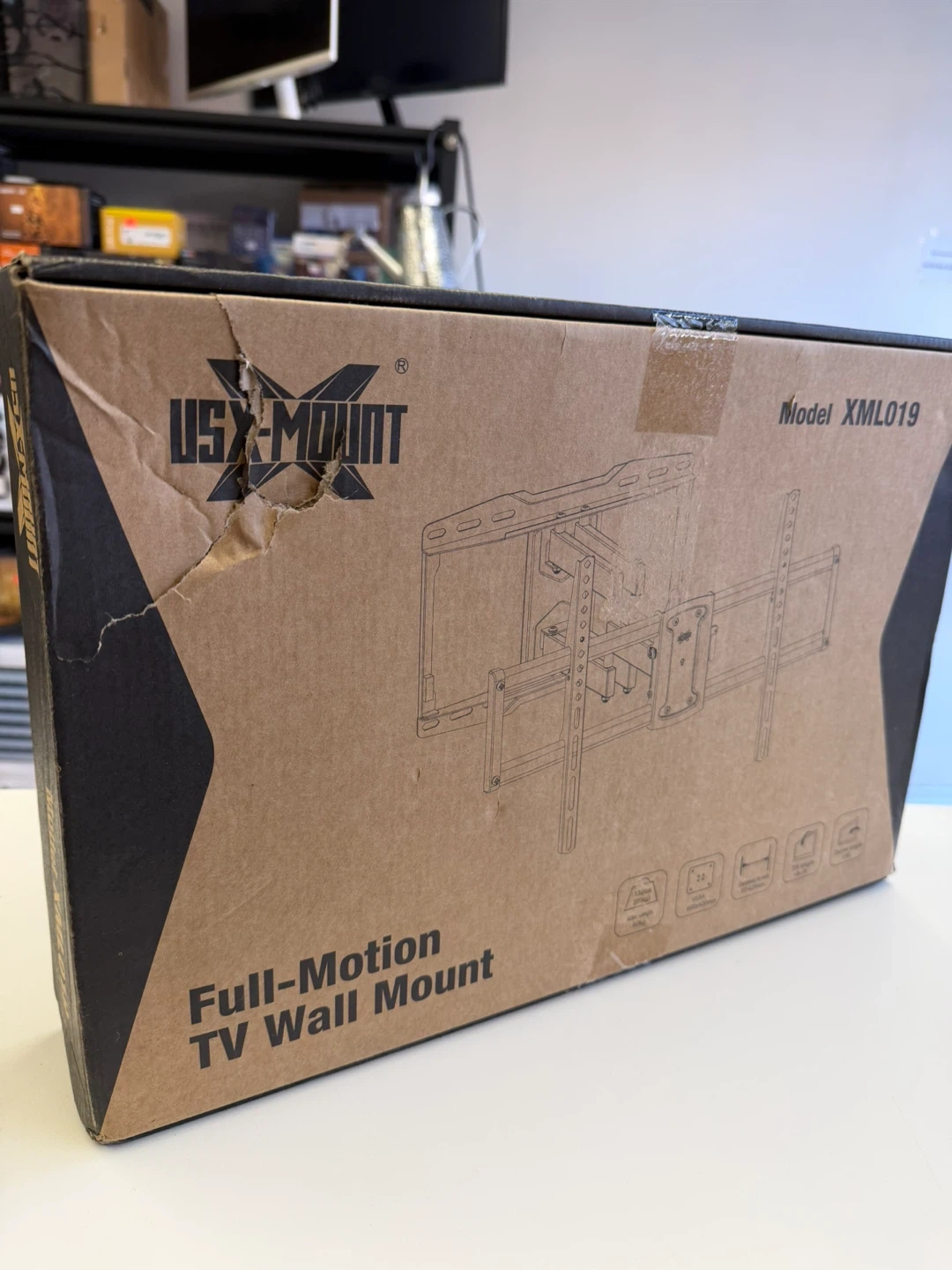 Selling a USX Mount full-motion TV wall mount, model XML019. It supports TVs from 47-84 inches and up to 132 lbs (60kg). The mount allows for a distance to the wall of 67-425mm, a tilt angle of +5/-15 degrees, and a swivel angle of ±45 degrees. It's VESA compatible up to 600x400mm. Comes with all the components and the original box