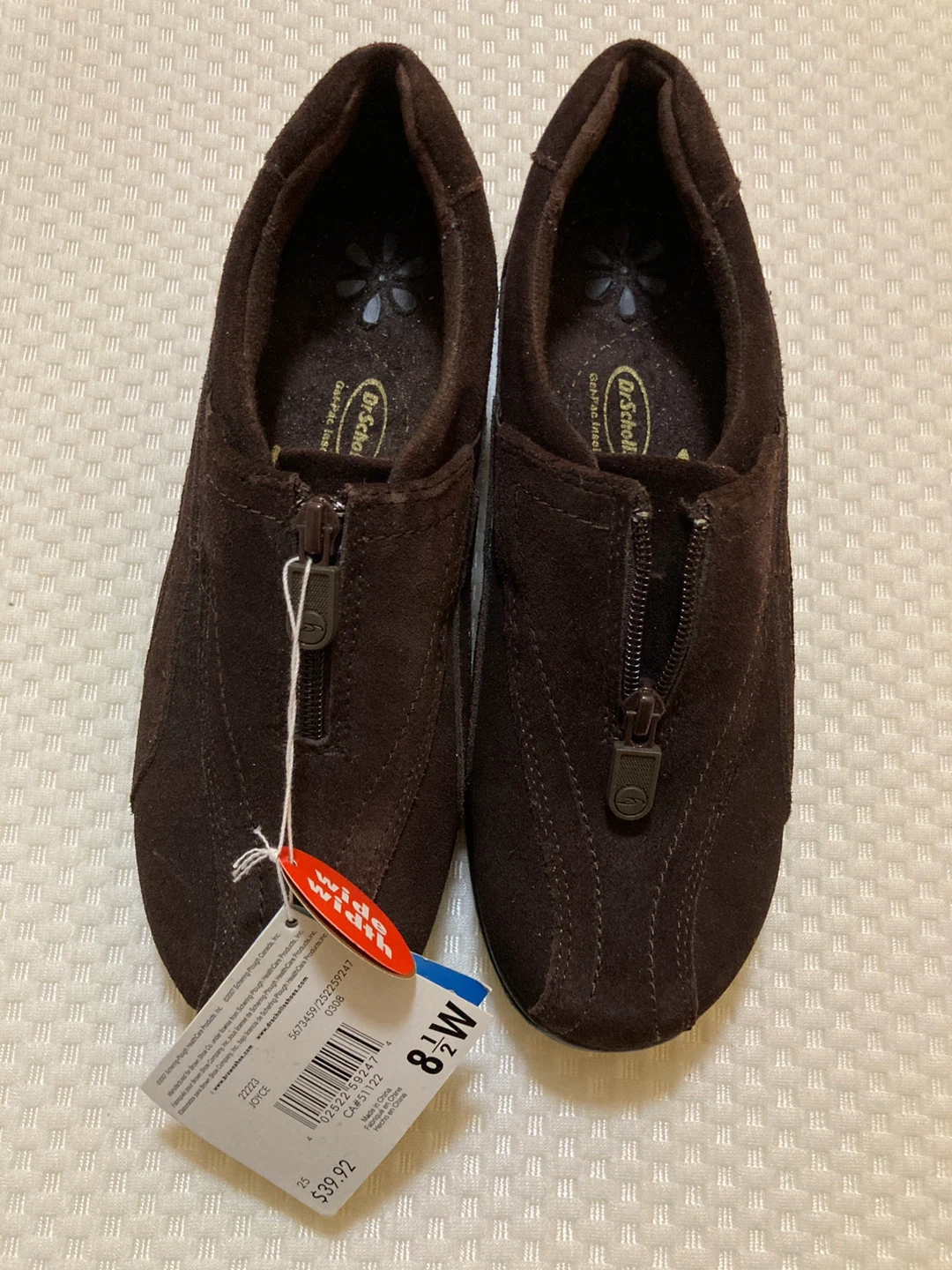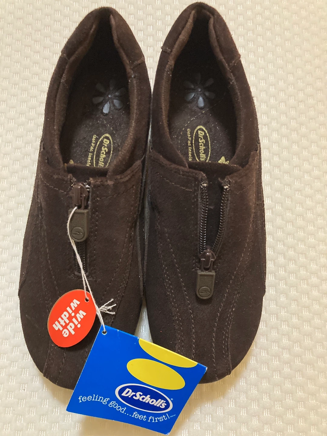 Selling a pair of Dr. Scholl's shoes in a lovely brown suede! They feature a convenient zipper and are a size 8.5 wide. The soles are in great shape, ready for comfortable wear!