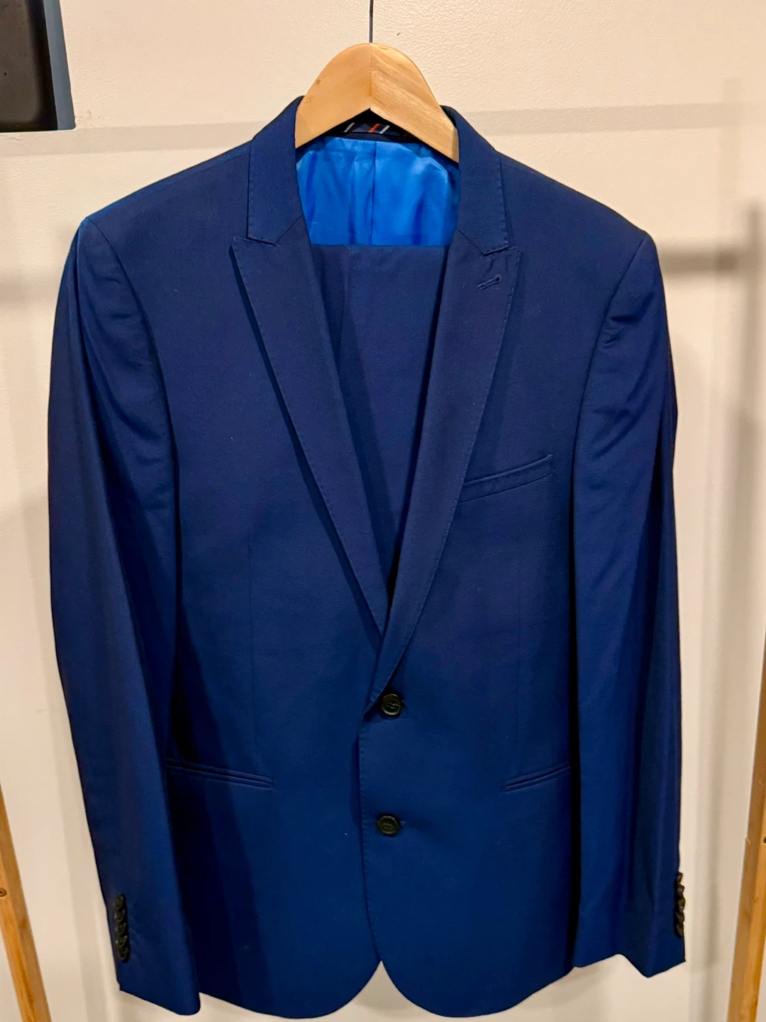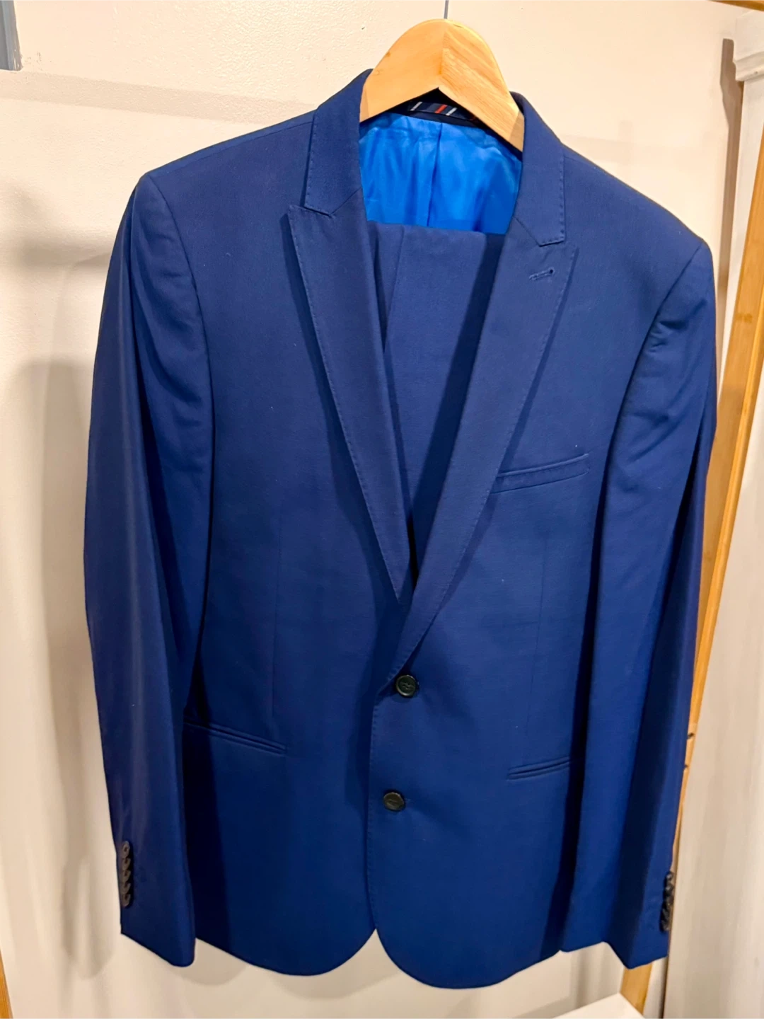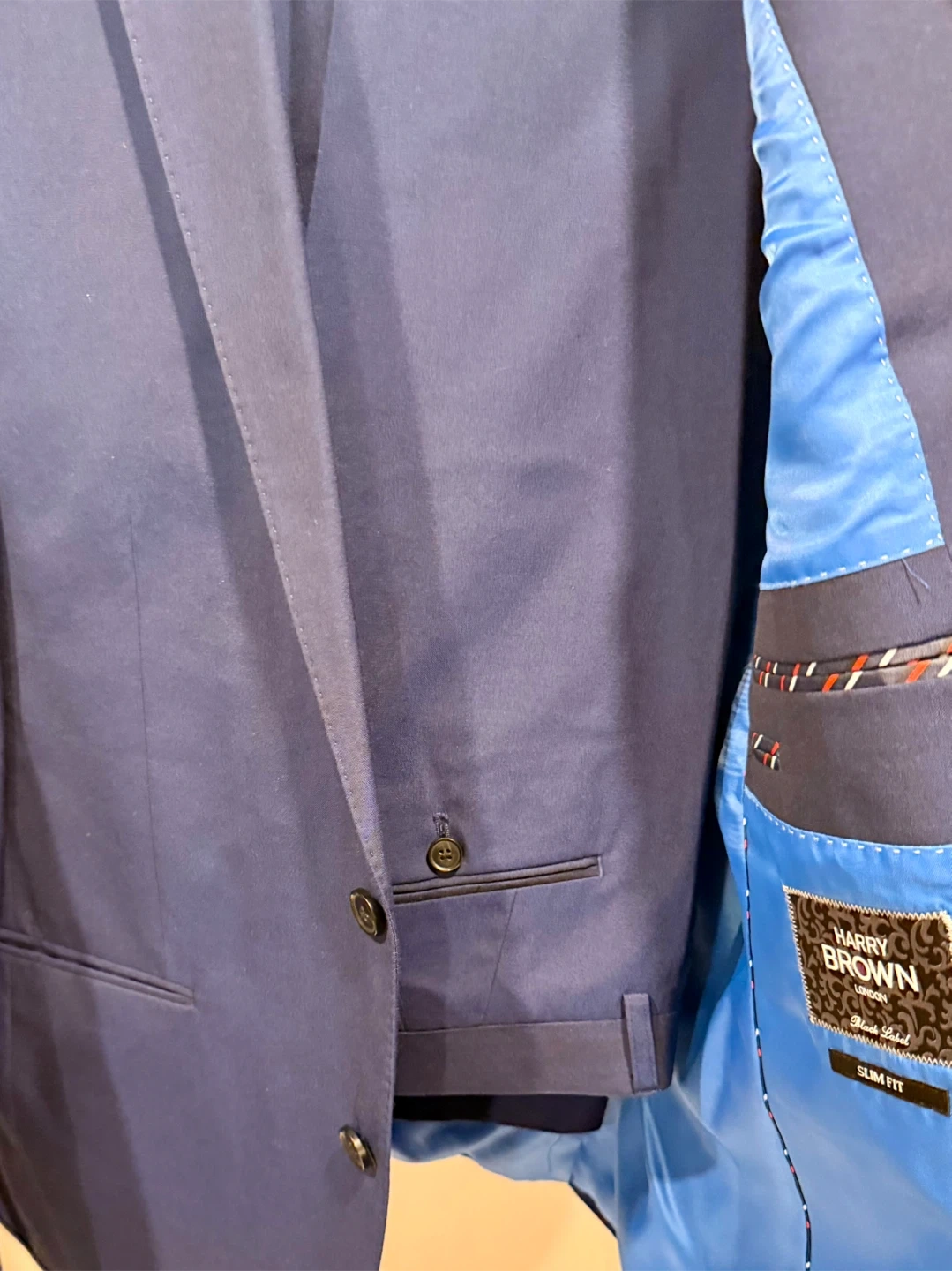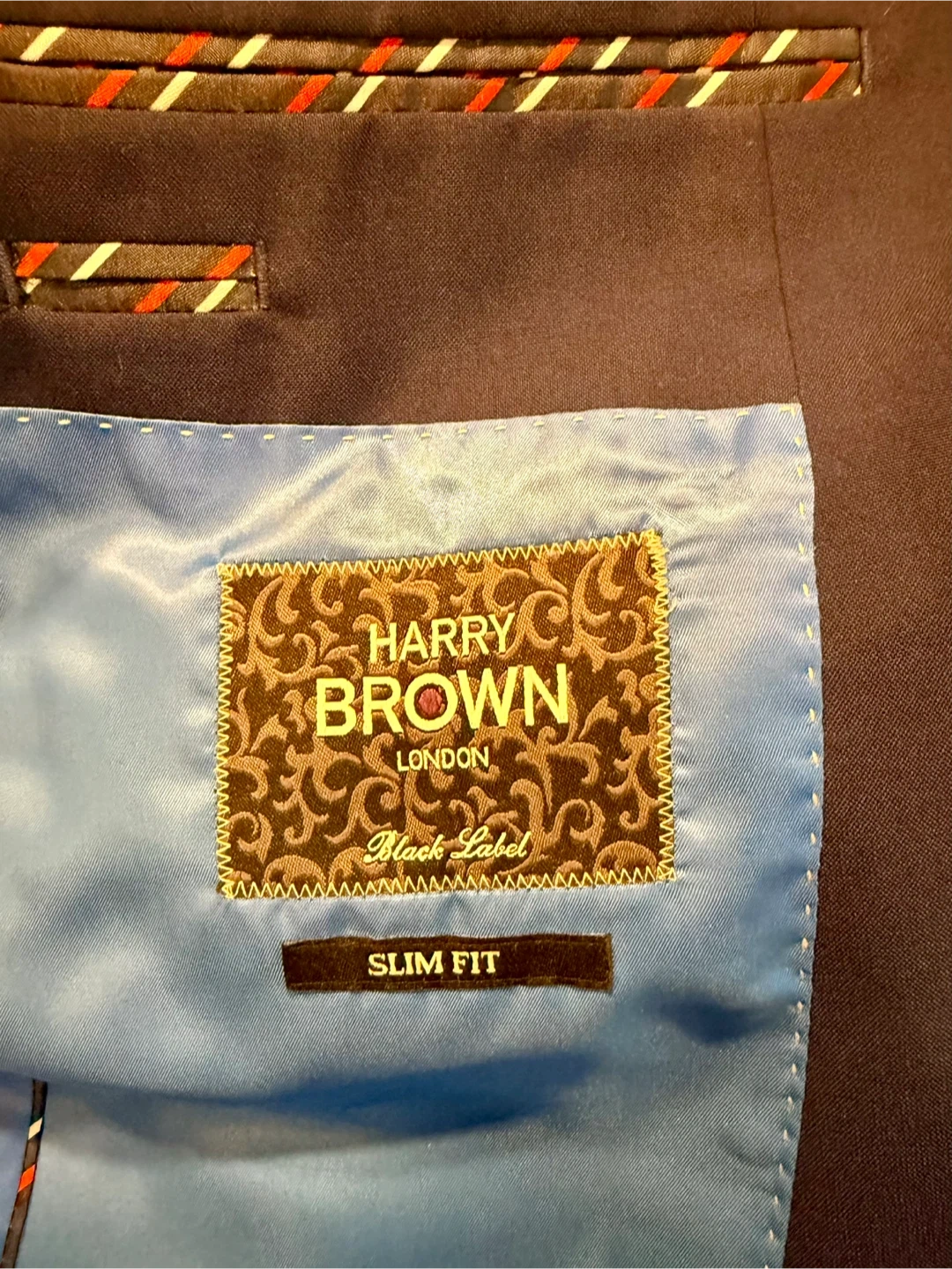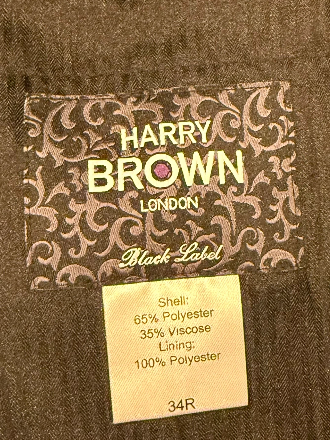 Selling a Harry Brown London Black Label suit in size 34R. The shell is made of 65% polyester and 35% viscose, with a 100% polyester lining. It's a slim fit and in great condition!