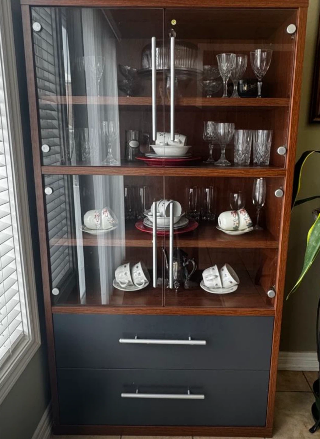 Selling a glass display cabinet with a brown and black finish. It features glass shelves and two drawers at the bottom for extra storage. Perfect for displaying your favourite items or storing dining ware!