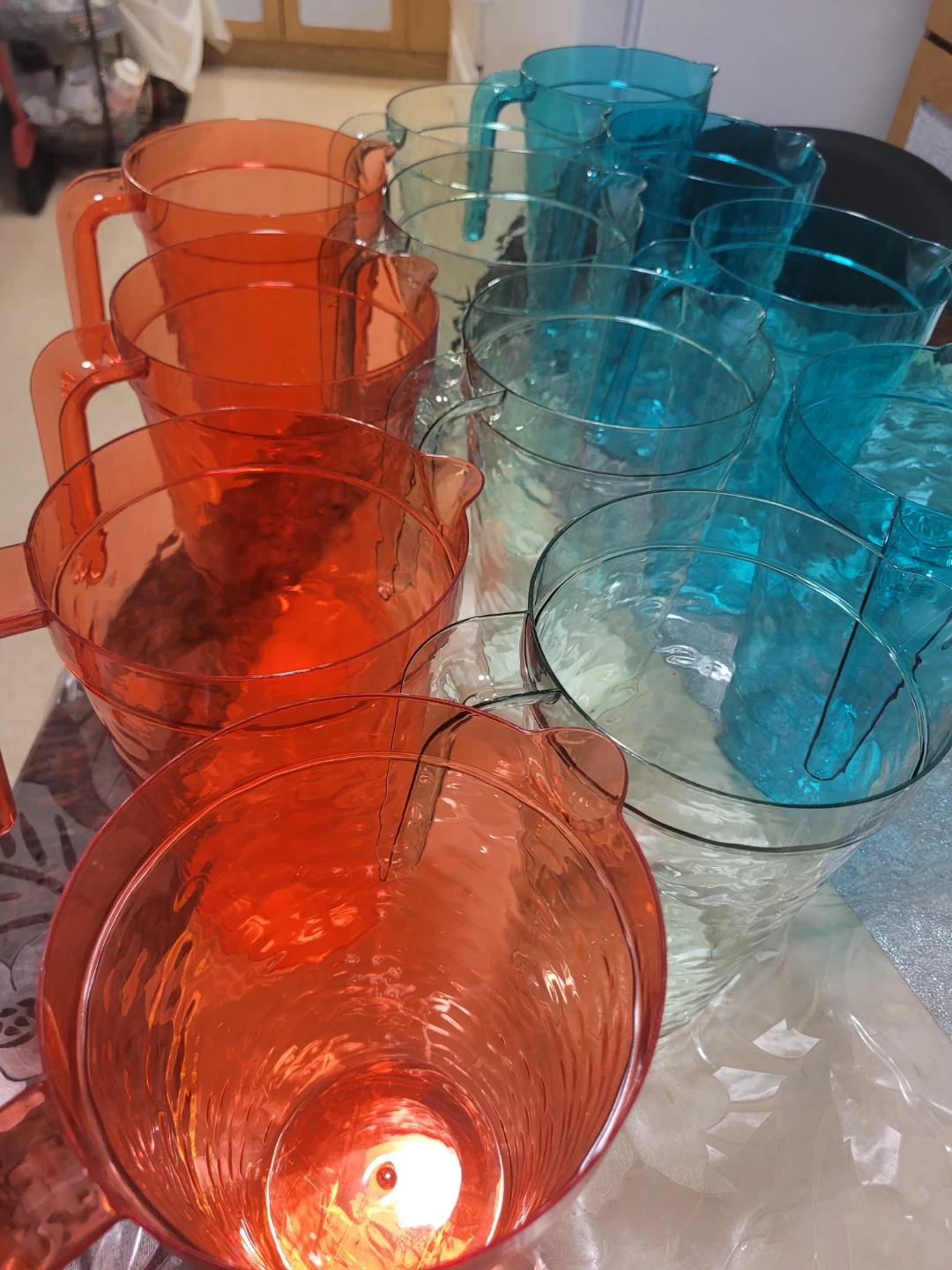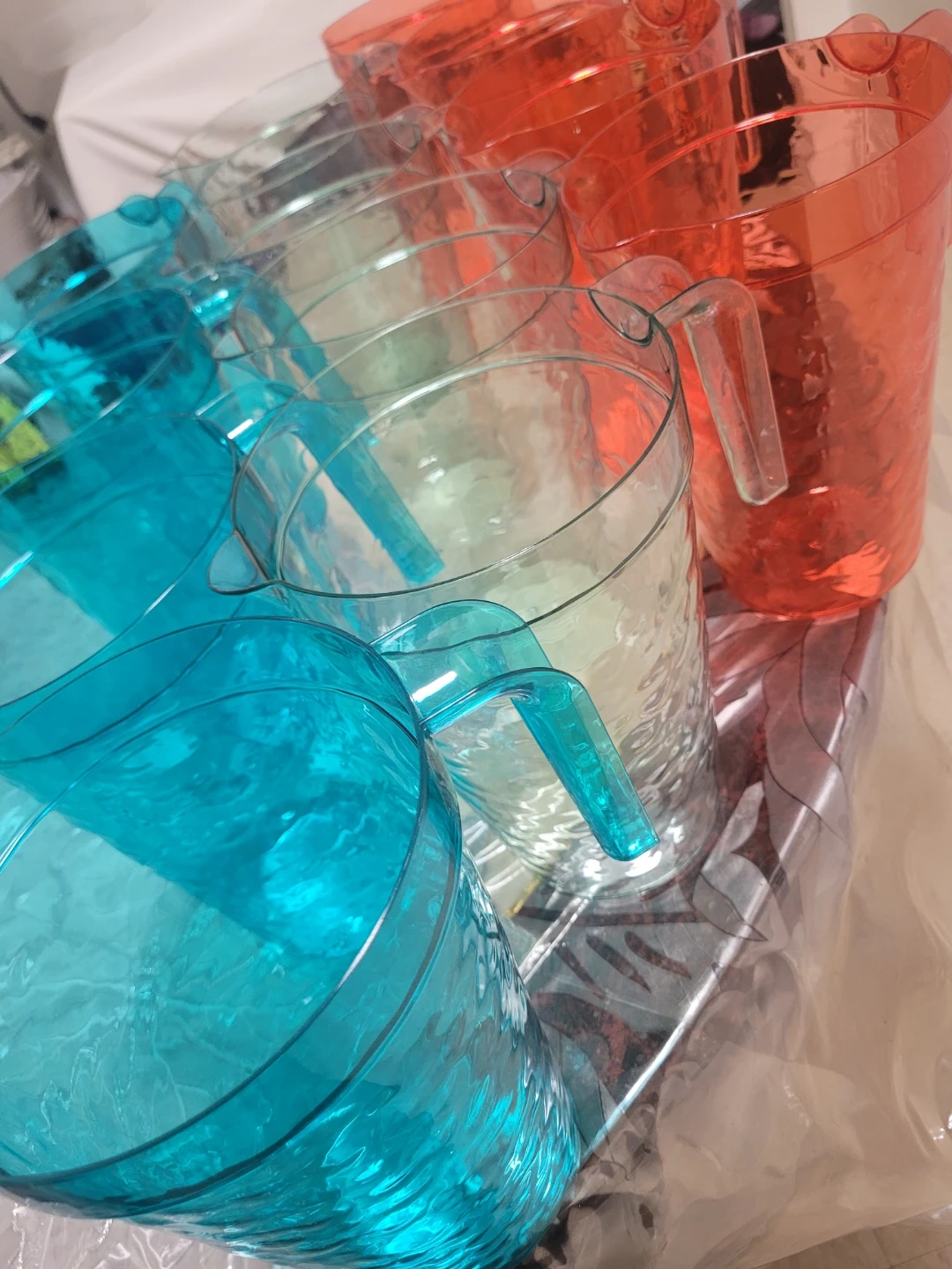 Selling a set of plastic pitchers in vibrant blue, clear, and orange colours. These are perfect for serving beverages at gatherings or for everyday use. They're lightweight and easy to handle, making them great for both indoor and outdoor settings