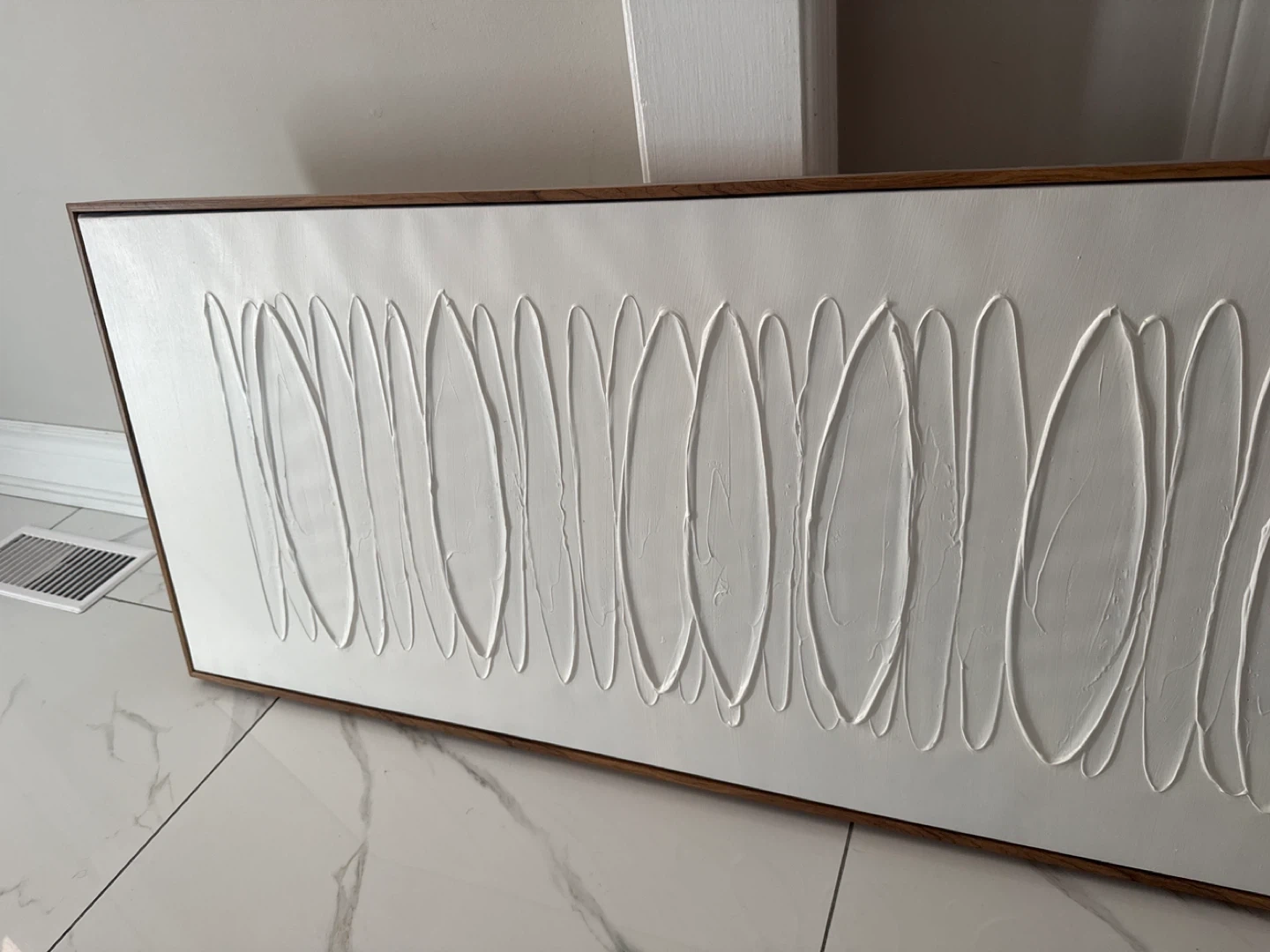 Selling a piece of abstract wall art. It features a white textured design on a rectangular canvas with a brown frame. It's in great condition and would add a modern touch to any room!