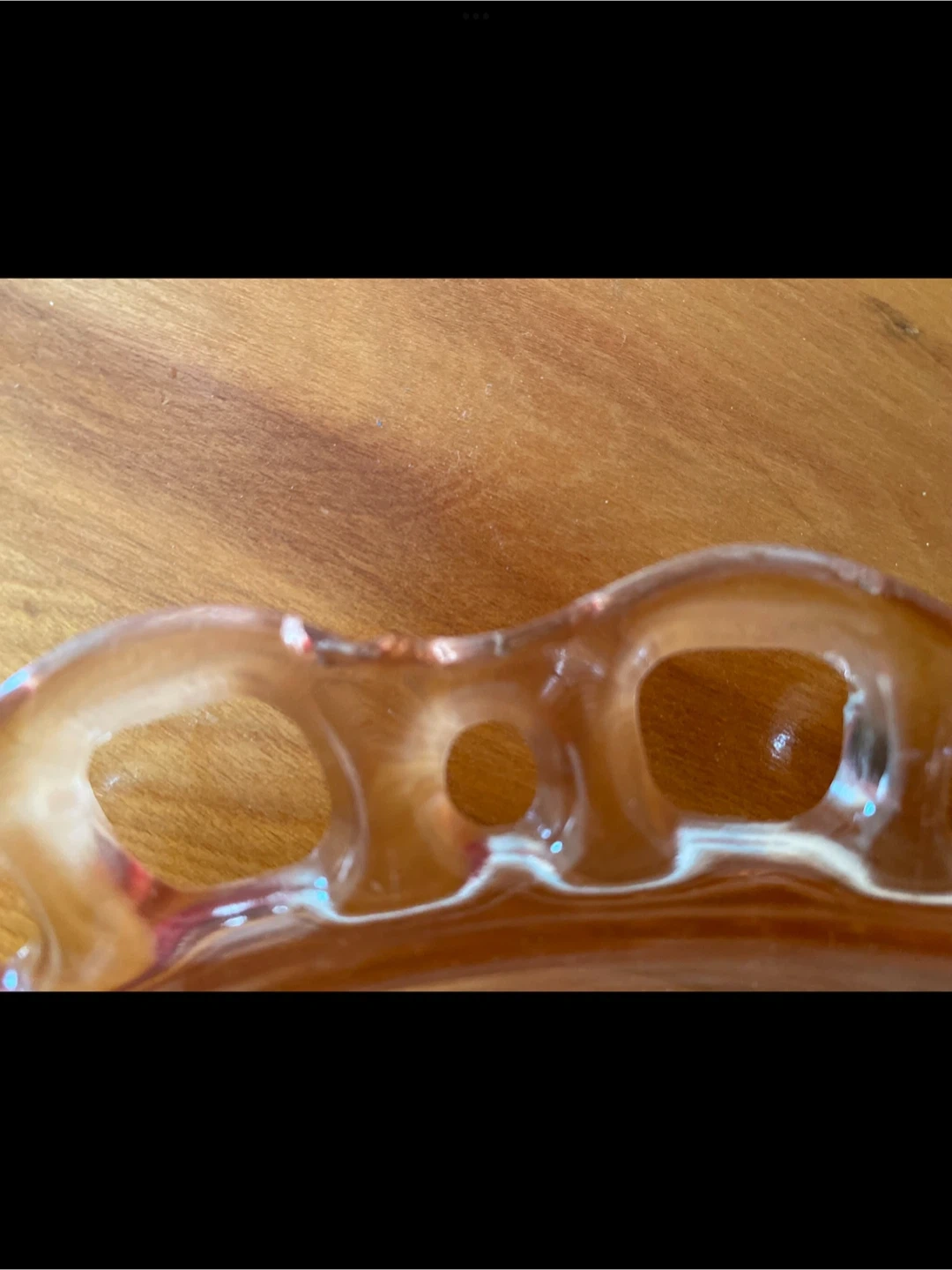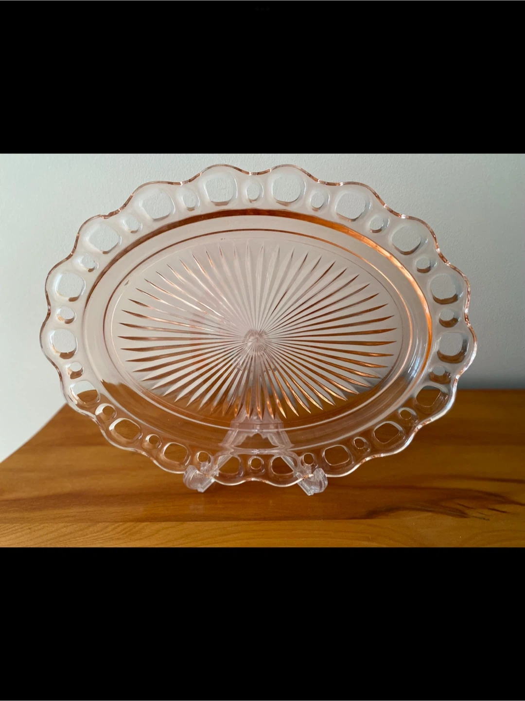 The oval dish is the Lace Edged pattern and is approximately 13 inches by 10 inches. It does a have chip in the outer edge (as shown in photo ) but is almost impossible to see or feel because of the scalloped pattern.