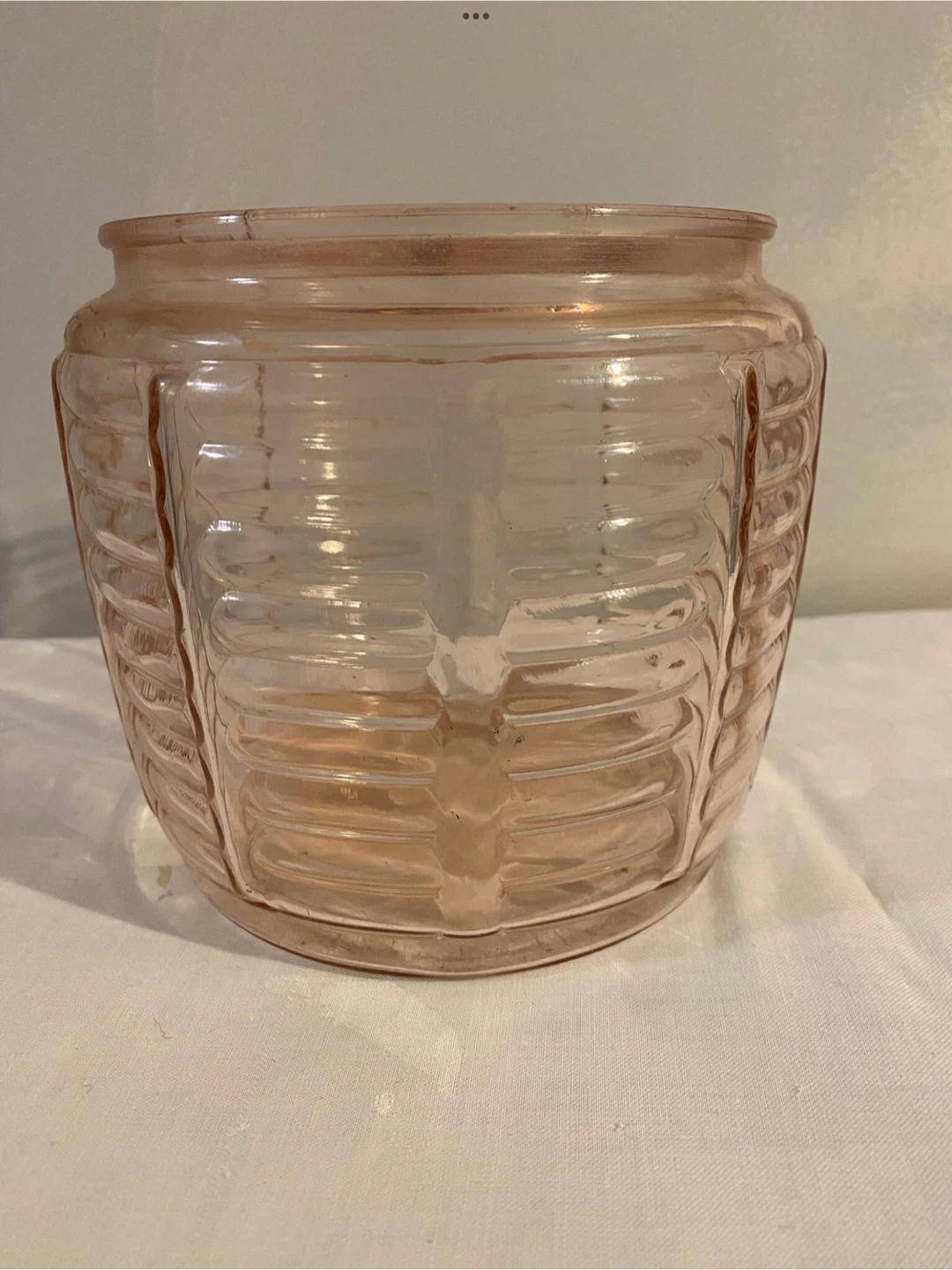 This includes a pink cookie jar, a vertical ribbed pattern. It is in good condition but the rim does have some roughness.