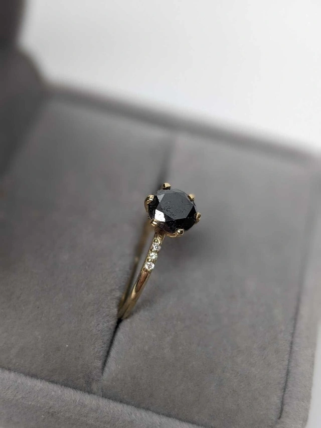 - Center Stone: 1.20ct treated black diamond, round brilliant cut, fancy black color, good cut