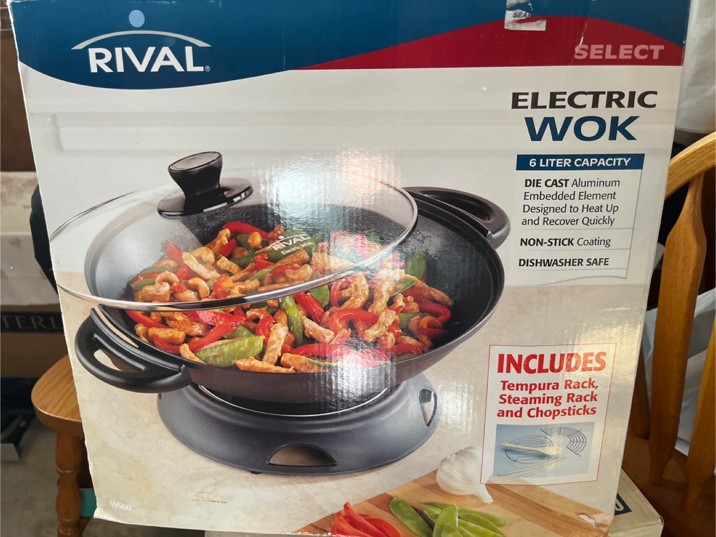 Selling a Rival Electric Wok with a 6-liter capacity! It features a die-cast aluminum embedded element designed to heat up and recover quickly. It also has a non-stick coating and is dishwasher safe.