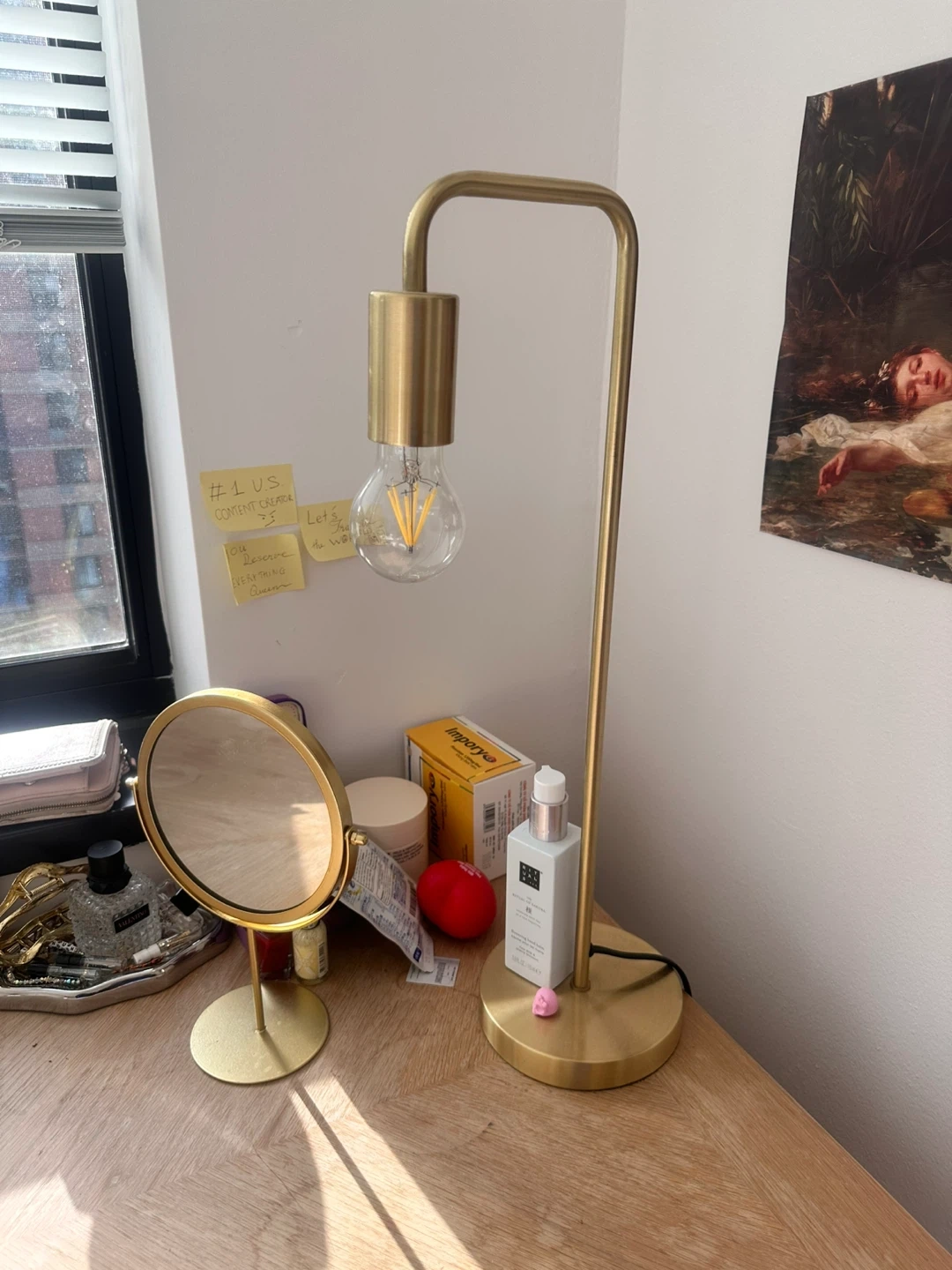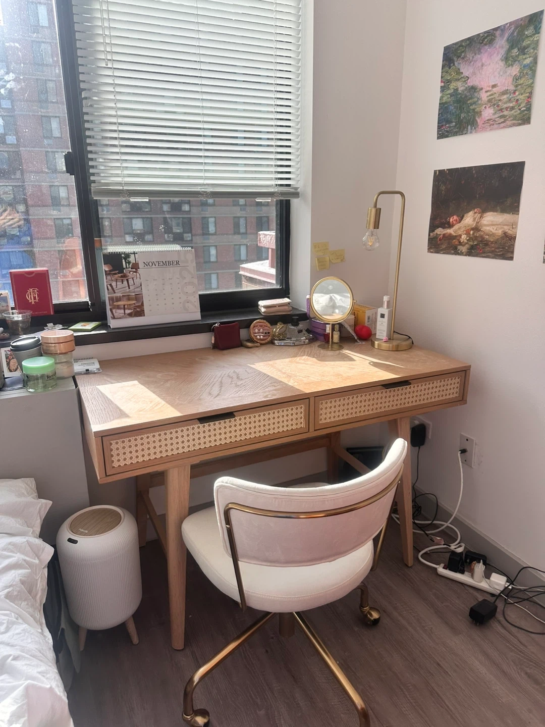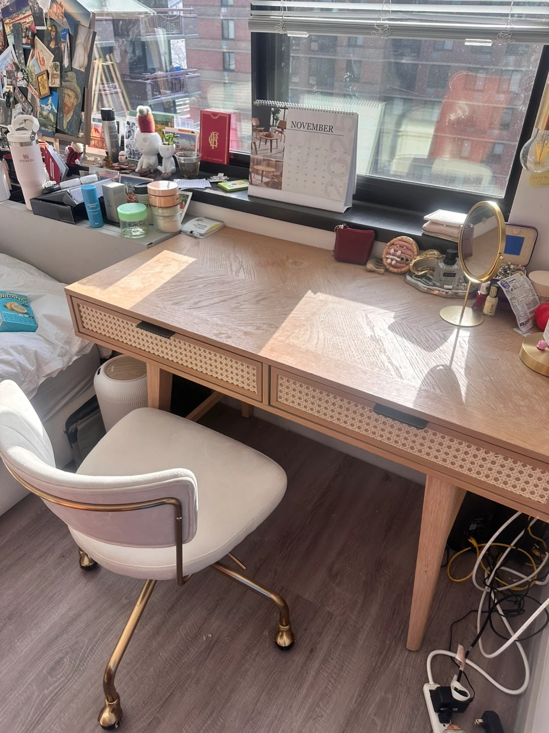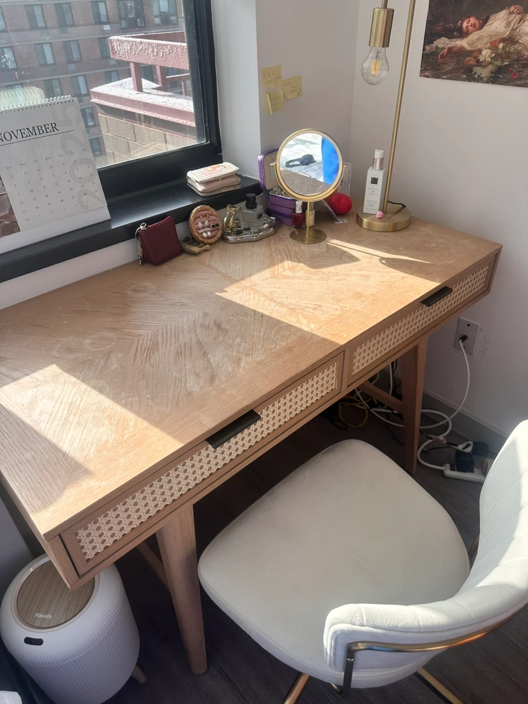 Selling a cute desk with a rattan drawer front and a matching chair! It's in great condition and would be perfect for a small space or home office. Free lamp