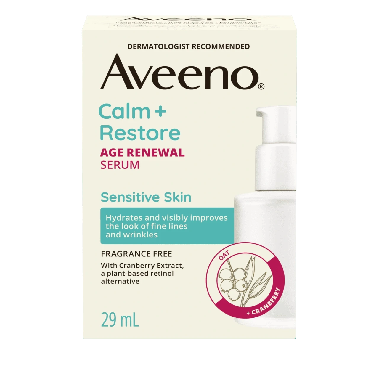 I'm selling an Aveeno Calm + Restore Age Renewal Serum for sensitive skin! This serum hydrates and visibly improves the look of fine lines and wrinkles. It's fragrance-free and contains cranberry extract, a plant-based retinol alternative. It comes in a 29 mL bottle